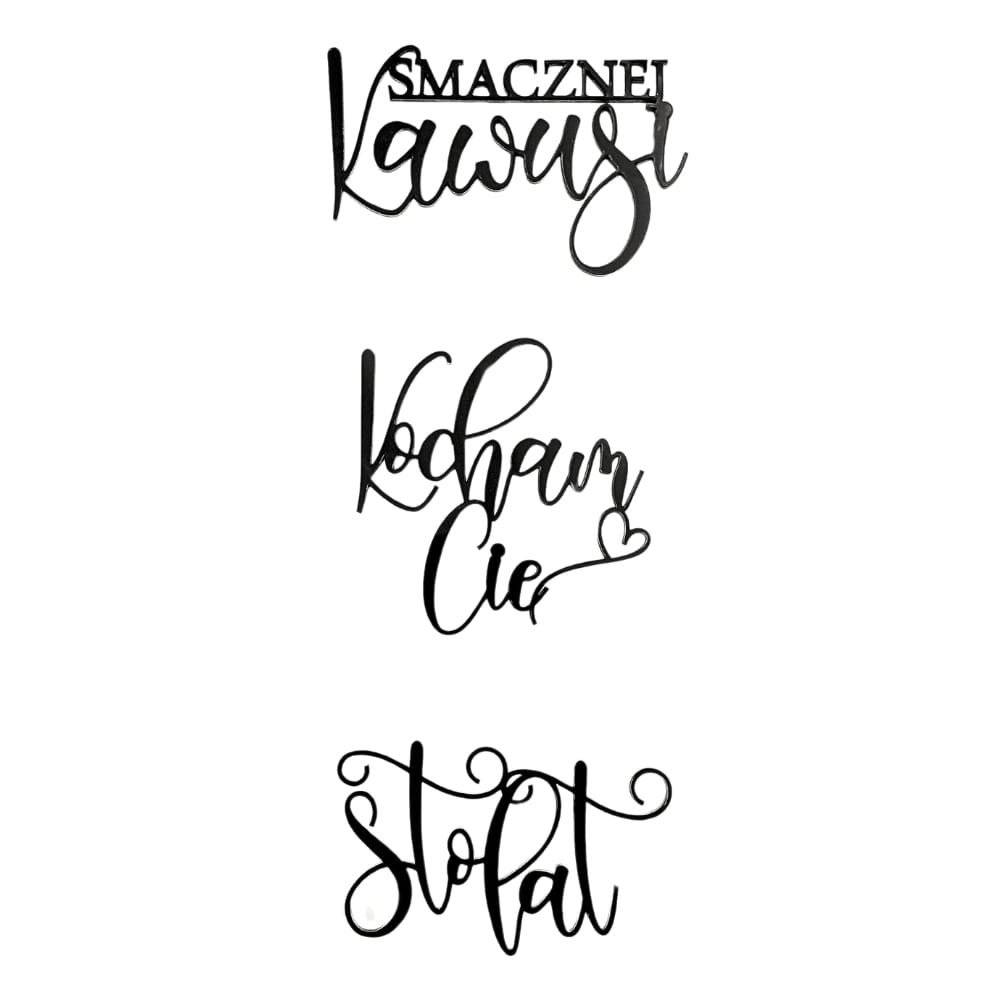 Toppery na tort to super modny komplet trzech dekorów stworzonych specjalnie z myślą o małych torcikach Bento Cake. Stworzone z myślą o położeniu na górę tortu, okrągłego deseru o średnicy 12 cm. Materiał jest bardzo mocny i wytrzymały. W skład zestawu wchodzą trzy różne wykonane piękną kursywą napisy: "Sto lat", "SMACZNEJ Kawusi", "Kocham Cię". Ozdobne zawijasy liter mocno przykuwają uwagę. To piękna czarna dekoracja niejadalna o matowym wykończeniu. Pozwala szybko i w zasadzie kompletnie udekorować każdy uroczy Bento Cake. Można ich także z powodzeniem użyć jak klasycznych topperów na bok tortu.