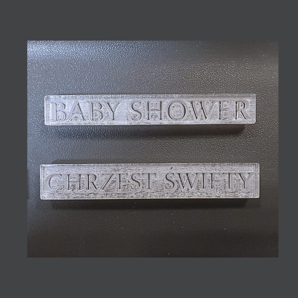- Napisy na stemplach: STO LAT, BABY SHOWER, CHRZEST ŚWIĘTY, PIERWSZA KOMUNIA ŚWIĘTA, URODZINY, KOCHAM CIĘ, ROCZEK, WESOŁYCH ŚWIĄT