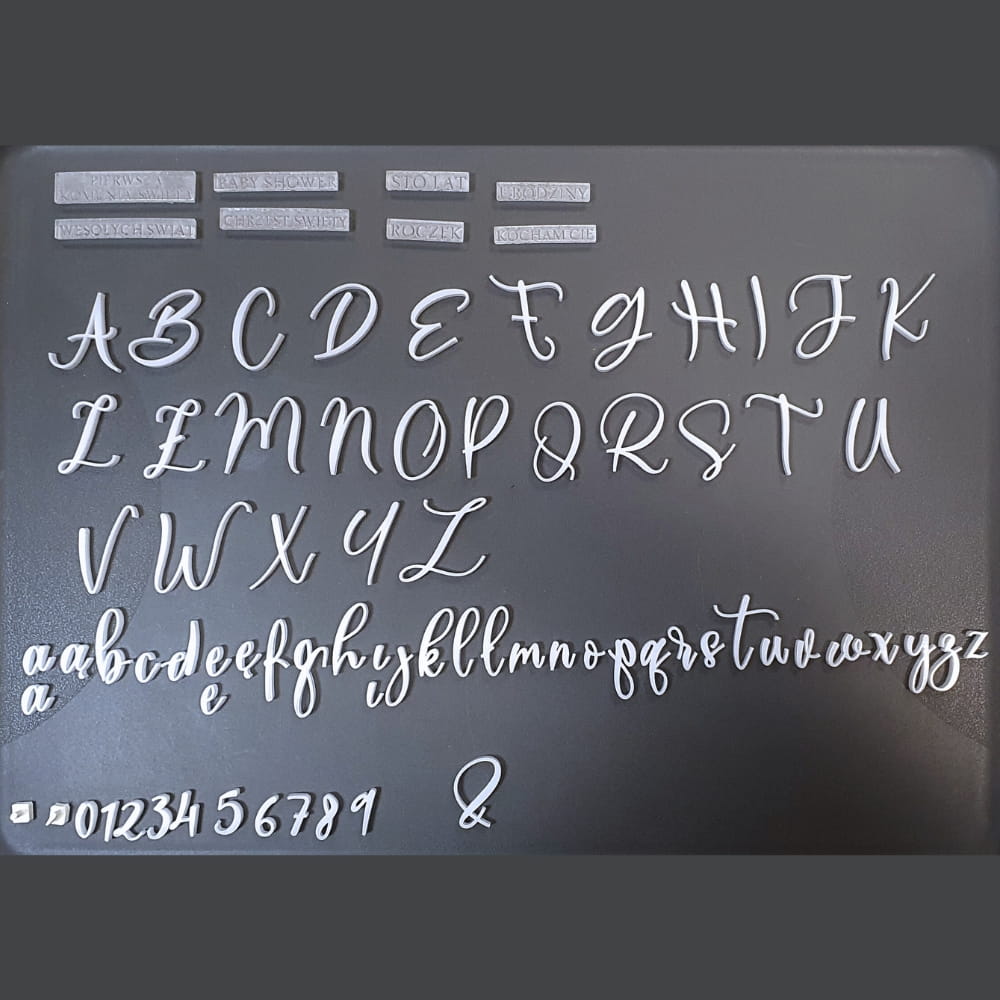 Alfabet do stemplowania połączony z grawerowanym zestawem uniwersalnych mini napisów do odciskania w masie cukrowej. Bogaty zestaw zapakowany w wygodny organizer pozwala szybko i prosto tworzyć wszelkie napisy i hasła. Zawiera małe i wielkie litery, cyfry oraz polskie czcionki, kropki i 8 stempelków z gotowymi napisami: STO LAT, BABY SHOWER, CHRZEST ŚWIĘTY, PIERWSZA KOMUNIA ŚWIĘTA, URODZINY, KOCHAM CIĘ, ROCZEK, WESOŁYCH ŚWIĄT. Wielkie litery mają wysokość około 3 cm. Elegancki, imitujący ręczne pismo krój liter będzie doskonale pasować do tortów i ciast z każdej okazji. Stempelki wykonane są z najwyższej jakości plexi, dopuszczonego do kontaktu z żywnością, a ścianki stemplujące mają wysokość 0,5 cm. To najlepszy sposób tworzenia napisów na tortach!