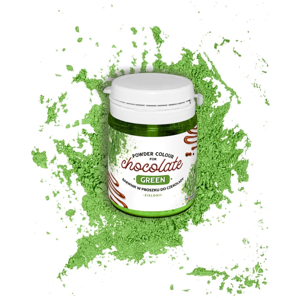 Zielony barwik spożywczy do czekolady w proszku. Tradycyjny, silnie skoncentrowany barwnik syntetyczny w postaci proszku. Zapewnia żywe kolory o wysokiej wydajności. Można go stosować do barwienia prawdziwej czekolady, czekoladek, pralin, masła kakaowego, śmietany, surogatów czekoladowych, mas tłustych oraz kremów. Szczególnie polecany do pralin, tłustych kremów i barwienia detali z czekolady. Barwnik nie wpływa na proces temperowania czekolady.