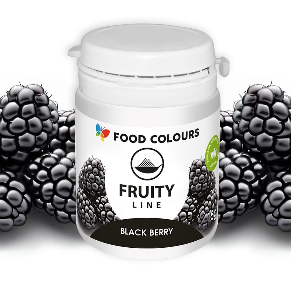 Czarny barwnik naturalny w proszku, rozpuszczalny w wodzie z linii barwników inspirowanych kolorami owoców. Black Berry to świeży, jeżynowy odcień czarnego. Barwniki Fruity Line z naturalnym pigmentem wnoszą owocową świeżość do cukiernictwa. Barwniki mają bardzo szerokie zastosowanie: do masy cukrowej, lukru królewskiego, kremów śmietanowych, biszkoptów, napojów, galaretek, dżemów i wielu innych produktów, opartych na bazie wody. Mogą być spożywane przez dzieci.