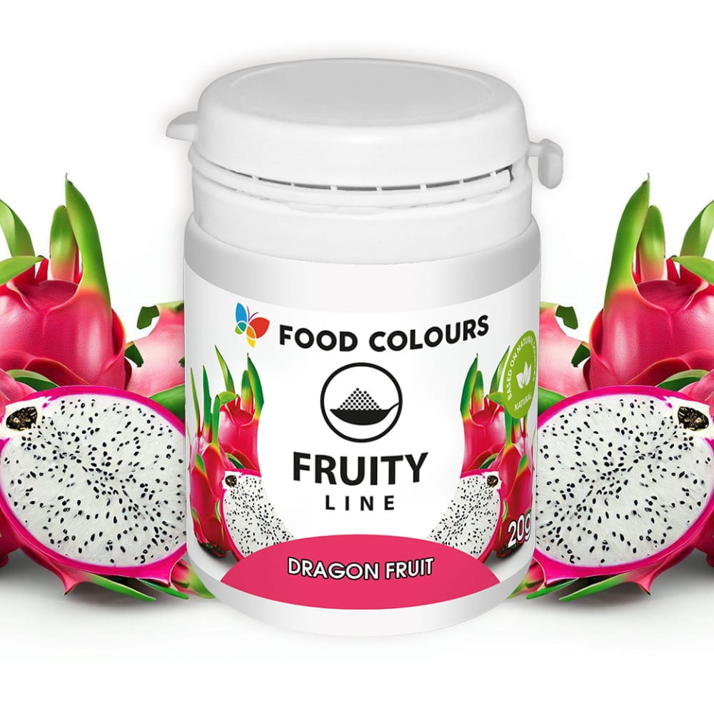 Różowy barwnik naturalny w proszku, rozpuszczalny w wodzie z linii barwników inspirowanych kolorami owoców. Dragon Fruit to świeży, intensywny odcień różowego. Barwniki Fruity Line z naturalnym pigmentem wnoszą owocową świeżość do cukiernictwa. Barwniki mają bardzo szerokie zastosowanie: do masy cukrowej, lukru królewskiego, kremów śmietanowych, biszkoptów, napojów, galaretek, dżemów i wielu innych produktów, opartych na bazie wody. Mogą być spożywane przez dzieci.