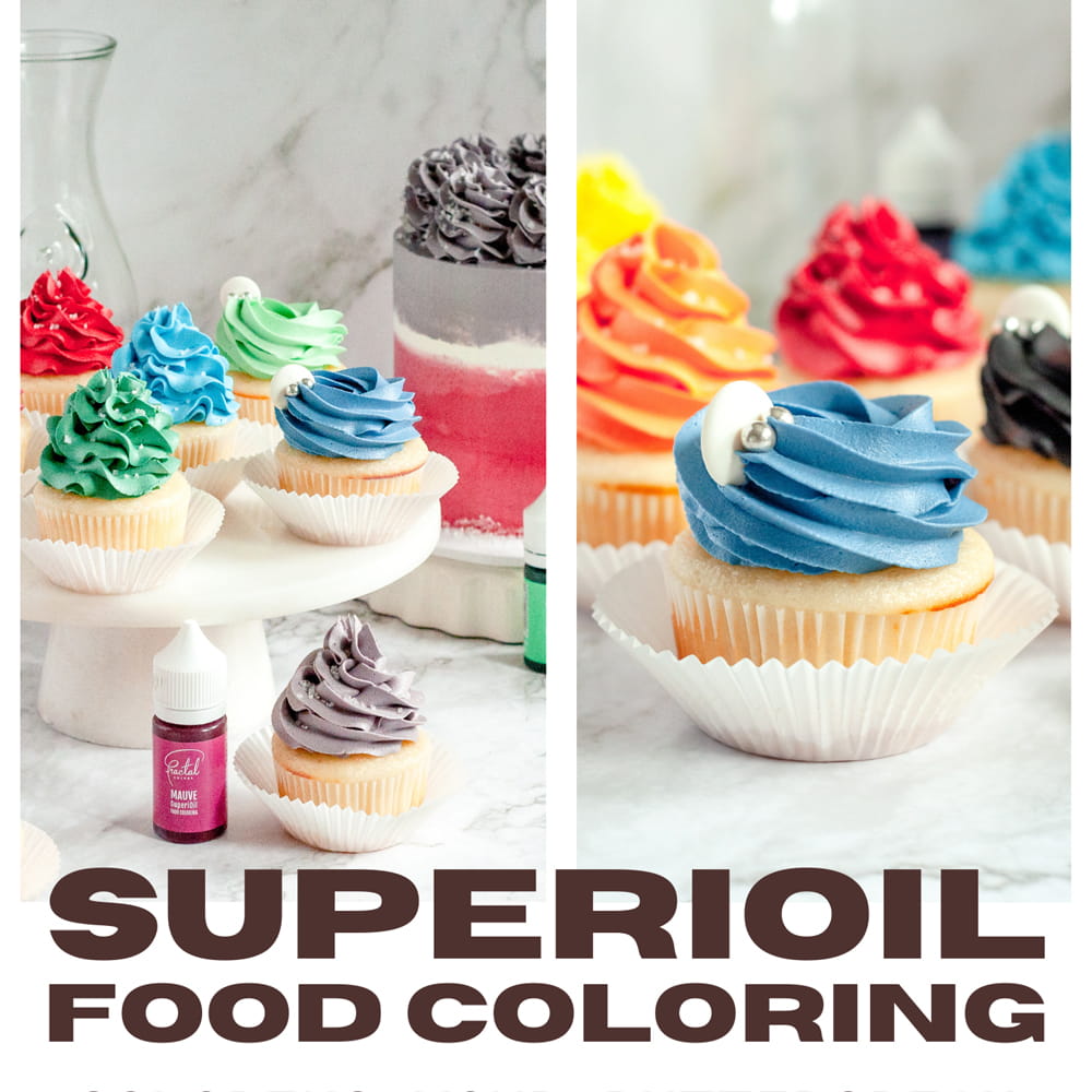 Płynne barwniki na bazie oleju, bardzo dobrze rozpuszczalne w tłuszczach, szczególnie odpowiednie do barwienia czekolady. Idealne również do barwienia kremów na bazie tłuszczu, takich jak śmietana i krem maślany. Wyróżniają się mocnym nasyceniem kolorów, wydajnością, dużą siłą krycia oraz łatwością wprowadzania w masę. Barwniki olejowe Fractal Colors są w 100% spożywcze i dostępne w palecie 10 pięknych kolorów. Podczas pracy z barwnikami SuperiOil zaleca się używanie tylko metalowych narzędzi, barwnik jest bardzo mocny i trudno go zmyć z materiałów takich jak plastik, drewno czy tkanina. Przed użyciem dobrze wstrząsnąć.