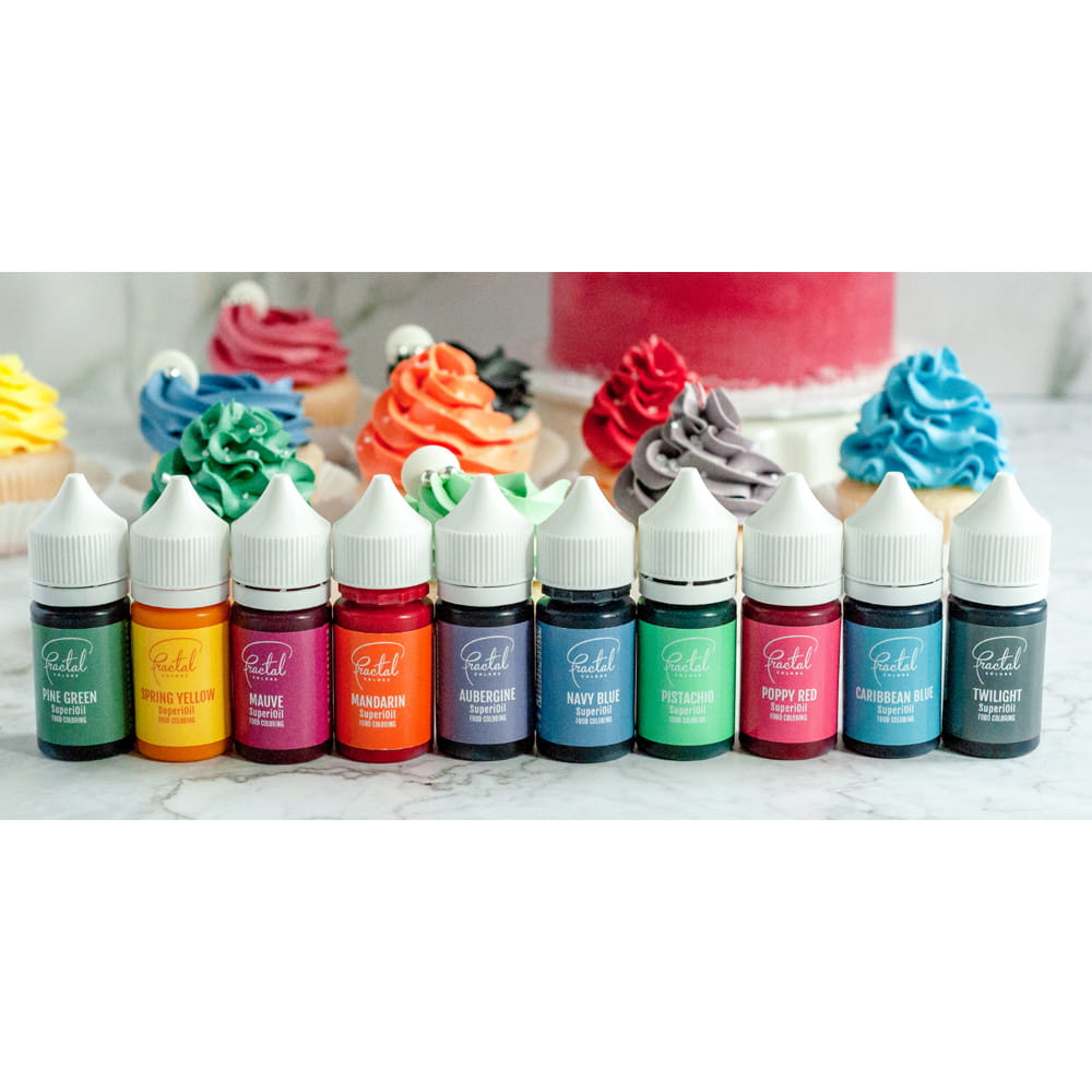 Płynne barwniki na bazie oleju, bardzo dobrze rozpuszczalne w tłuszczach, szczególnie odpowiednie do barwienia czekolady. Idealne również do barwienia kremów na bazie tłuszczu, takich jak śmietana i krem maślany. Wyróżniają się mocnym nasyceniem kolorów, wydajnością, dużą siłą krycia oraz łatwością wprowadzania w masę. Barwniki olejowe Fractal Colors są w 100% spożywcze i dostępne w palecie 10 pięknych kolorów. Podczas pracy z barwnikami SuperiOil zaleca się używanie tylko metalowych narzędzi, barwnik jest bardzo mocny i trudno go zmyć z materiałów takich jak plastik, drewno czy tkanina. Przed użyciem dobrze wstrząsnąć.