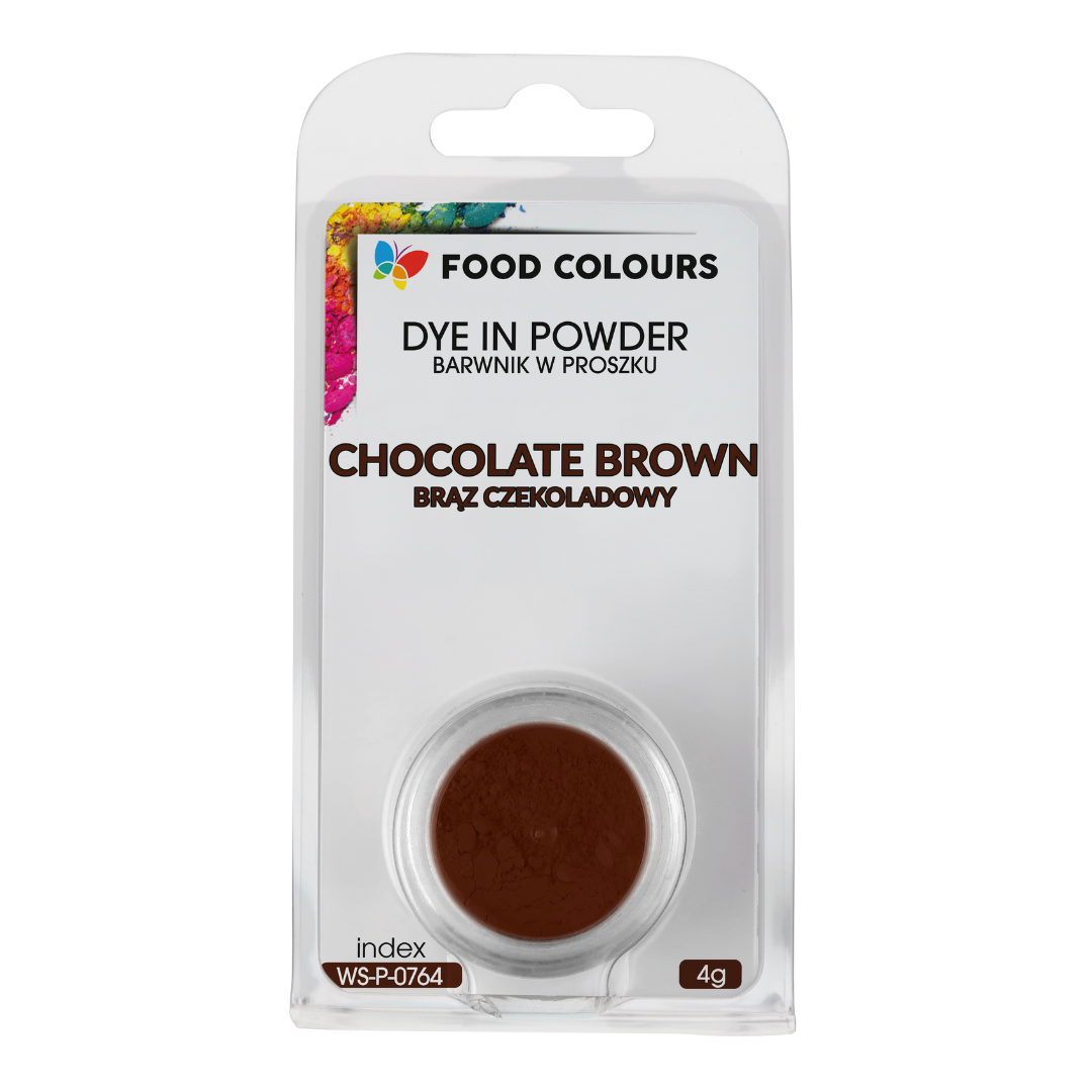 Czekoladowy barwnik spożywczy w postaci proszku. Tradycyjny, najmocniej skoncentrowany barwnik syntetyczny w proszku. Jest bardzo wydajny, zapewnia intensywne wybarwienie nawet przy minimalnych dozach! Można go zastosować do wszystkich produktów zawierających wodę. Rozpuszczalny w wodzie, alkoholu, glikolu i glicerynie. Nie rozrzedza i nie zmienia konsystencji ciasta. Nie nadaje się do mas tłustych.