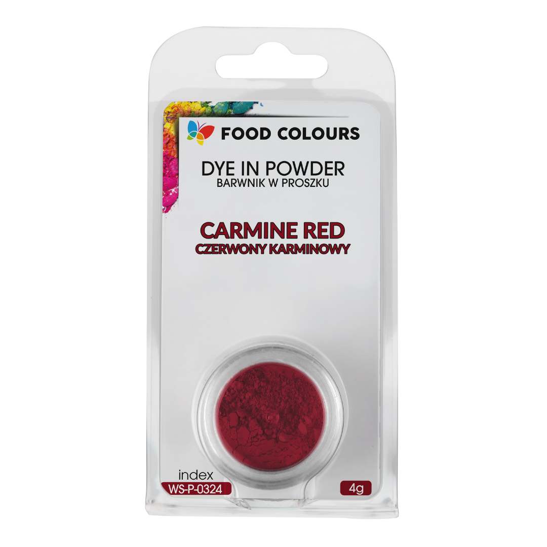 Karminowy barwnik spożywczy w postaci proszku. Tradycyjny, najmocniej skoncentrowany barwnik syntetyczny w proszku. Jest bardzo wydajny, zapewnia intensywne wybarwienie nawet przy minimalnych dozach! Można go zastosować do wszystkich produktów zawierających wodę. Rozpuszczalny w wodzie, alkoholu, glikolu i glicerynie. Nie rozrzedza i nie zmienia konsystencji ciasta. Nie nadaje się do mas tłustych.
