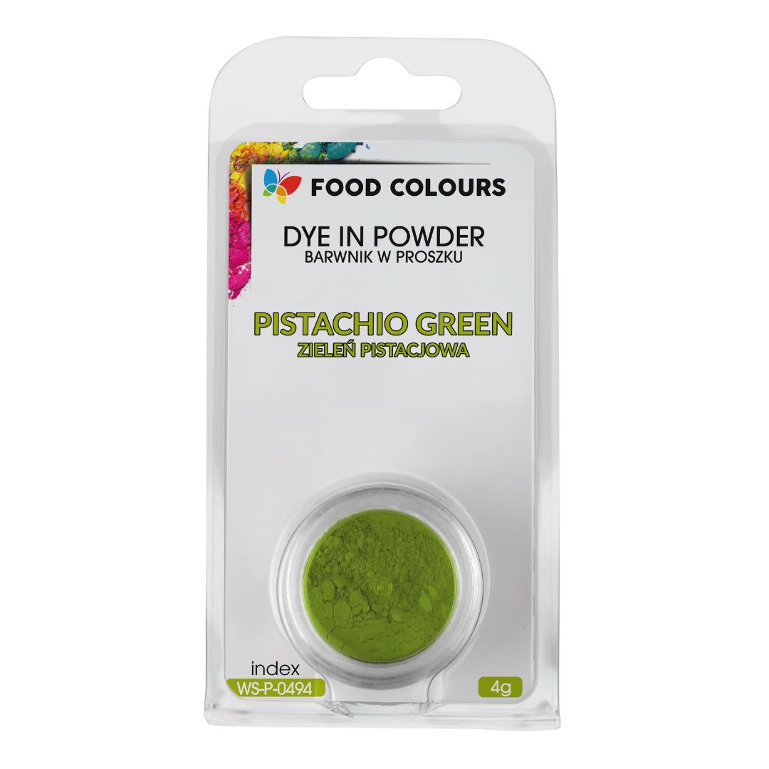 Pistacjowy barwnik spożywczy w postaci proszku. Tradycyjny, najmocniej skoncentrowany barwnik syntetyczny w proszku. Jest bardzo wydajny, zapewnia intensywne wybarwienie nawet przy minimalnych dozach! Można go zastosować do wszystkich produktów zawierających wodę. Rozpuszczalny w wodzie, alkoholu, glikolu i glicerynie. Nie rozrzedza i nie zmienia konsystencji ciasta. Nie nadaje się do mas tłustych.