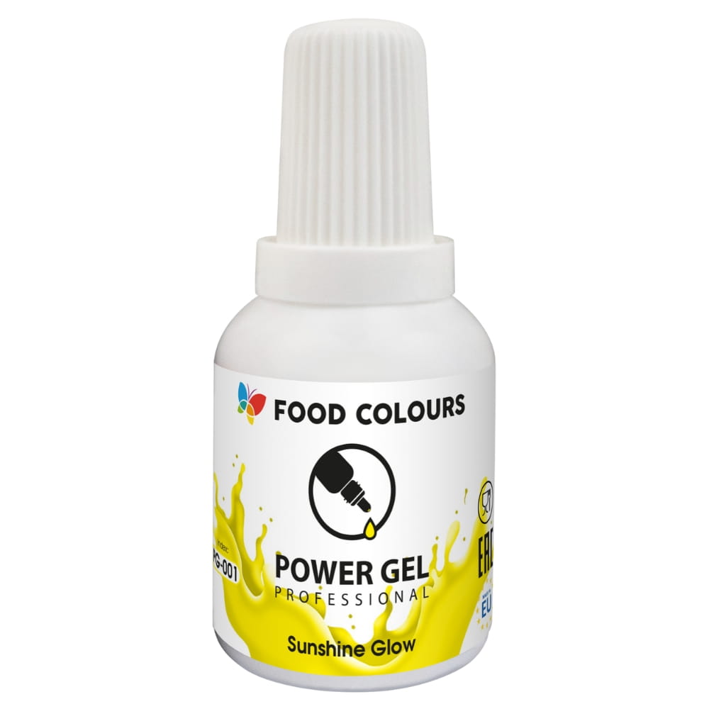 Barwnik spożywczy w żelu, w kolorze jasnożółtym. Odcień Sunshine Glow, to delikatny, jasny żółty. Barwnik jest zapakowany w praktyczną buteleczkę z wygodnym zakraplaczem, ułatwiającym precyzyjne dozowanie. Buteleczka posiada bezpieczne zamknięcie, dzięki czemu barwnik nie wysycha i nie wylewa się. Barwnik wystarczy dodać do masy cukrowej lub kremu i odpowiednio wymieszać albo ugnieść. Dzięki niskiej zawartości wody łatwo wrabia się w masy cukiernicze. Nie zalecany do użycia z masami tłuszczowymi. Wysoka koncentracja barwnika sprawia, że jest on bardzo wydajny. Doskonale sprawdzi się przy wypieku ciast, muffinów, lodów, a także przy dekorowaniu tortów czy innych słodkości.