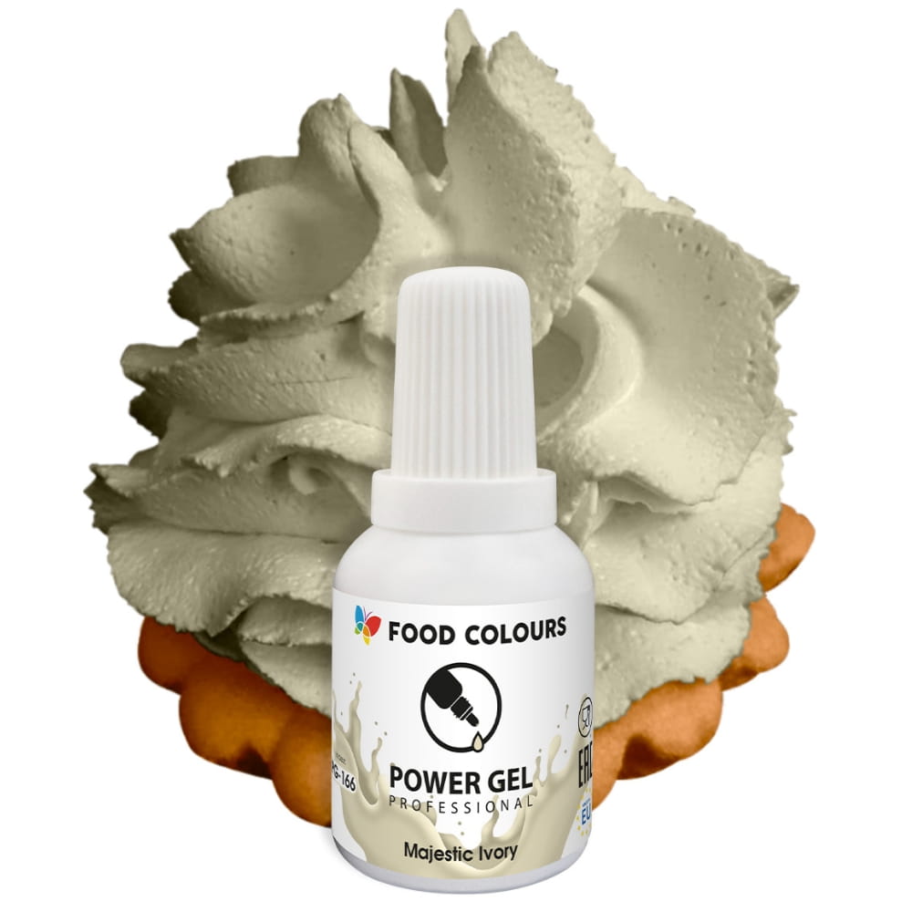 Barwnik spożywczy w żelu, w kolorze kości słoniowej. Odcień Majestic Ivory, to naturalny lekko kremowy odcien bieli. Barwnik jest zapakowany w praktyczną buteleczkę z wygodnym zakraplaczem, ułatwiającym precyzyjne dozowanie. Buteleczka posiada bezpieczne zamknięcie, dzięki czemu barwnik nie wysycha i nie wylewa się. Barwnik wystarczy dodać do masy cukrowej lub kremu i odpowiednio wymieszać albo ugnieść. Dzięki niskiej zawartości wody łatwo wrabia się w masy cukiernicze. Nie zalecany do użycia z masami tłuszczowymi. Wysoka koncentracja barwnika sprawia, że jest on bardzo wydajny. Doskonale sprawdzi się przy wypieku ciast, muffinów, lodów, a także przy dekorowaniu tortów czy innych słodkości.
