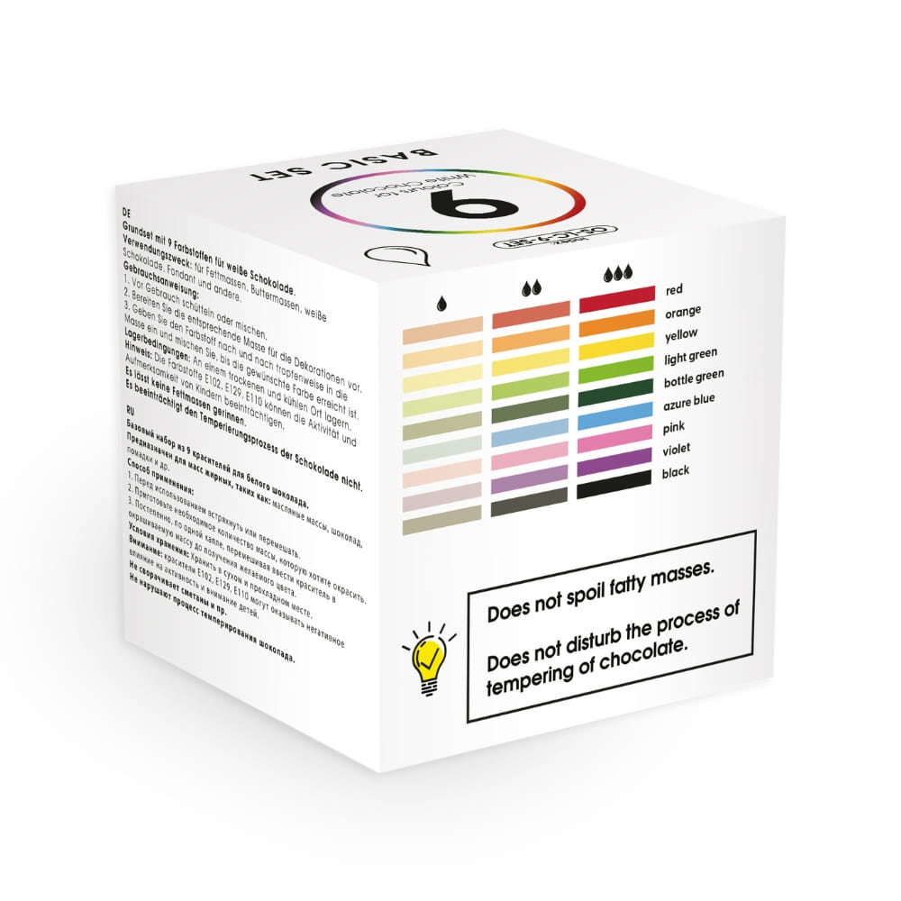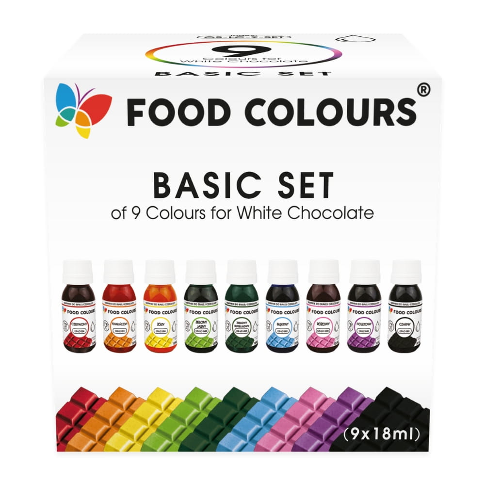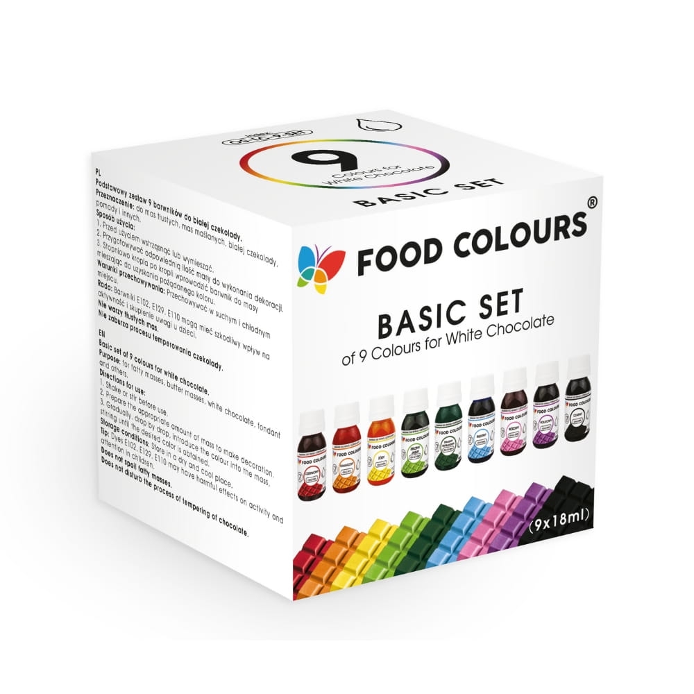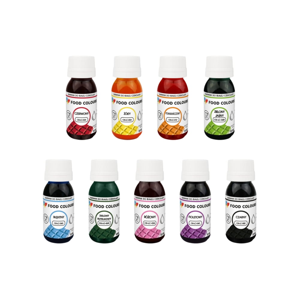 Barwniki w płynie do czekolady i mas tłustych. Zestaw 9 najczęściej używanych kolorów: żółty, błękitny, czerwony, pomarańczowy, jasny zielony, fioletowy, różowy, butelkowy zielony oraz czarny. Barwniki w postaci wygodnej do użycia emulsji. Każdy w poręcznej buteleczce, która pozwala na dozowanie kropelkowe. Te wysokiej jakości barwniki będą idealne do farbowania białej czekolady. Dzięki zastosowaniu oleju bardzo dobrze rozprowadzają się w masie czekoladowej. Zastosowanie: barwienie czekolady, mas czekoladowych, masła kakaowego, kremów i polew na bazie tłuszczy, śmietany. Gotowy zestaw to doskonały pomysł na rozpoczęcie przygody z barwnikami do czekolady i mas tłustych!
