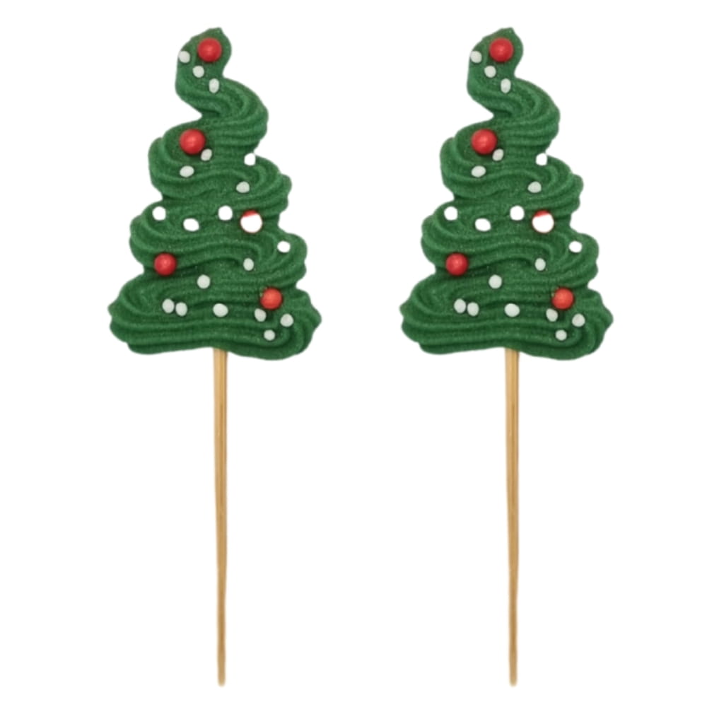 Bezy na patyku to przepiękna dekoracja cukrowa w formie topperów, łatwych do wbicia w tort, ciasto, deser, babeczkę, muffinkę i każdy inną słodkość, jaką zapragniemy. Mogą być użyte jako toppery na tort: dzięki patyczkowi beza nie będzie mieć kontaktu z masą na torcie. Doskonale się sprawdzą jako piękne pikery ozdabiające babeczki, muffinki i desery. To super prosty i szybki sposób na dekoracje! Piękna beza w kształcie zielonej choinki jest ozdobiona kolorowymi perełkami imitującymi bombki i umieszczona na niejadalnym patyczku. Choinka ma około 5 cm, długość całkowita wraz z nóżką to około 11 cm. W opakowaniu 2 szt.