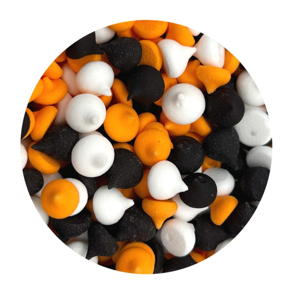 Kolorowe halloweenowe beziki w trzech jesiennych kolorach: pomarańczowym, czarnym i białym. Te mini beziki w formie kropelek to idealna ozdoba tortów, muffinek, babeczek, ciast, deserów, wypieków, cake pops i wielu innych słodkości. Można używać ich w całości lub pokruszyć, układać lub obsypać jak posypką. Wszystkie chwyty dozwolone! Beziki oferują pięknie kompozycję kontrastujących kolorów. Lekkość, chrupkość i słodki smak bezy. W wygodnym małym zamykanym pojemniczku.