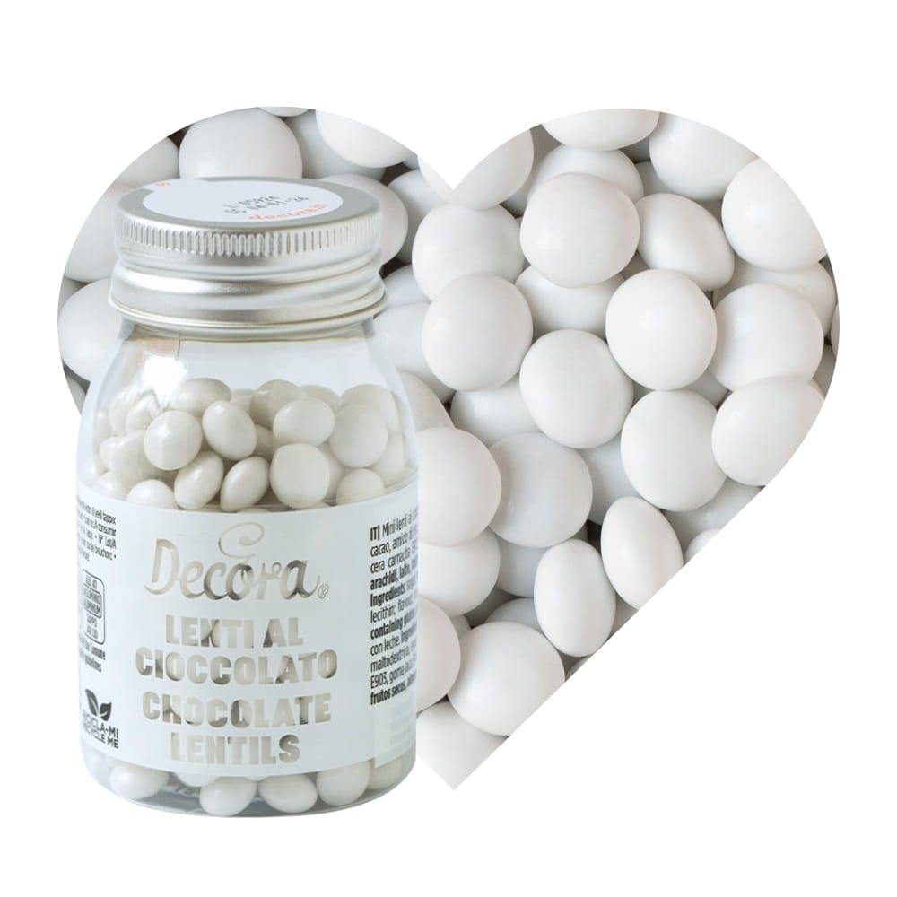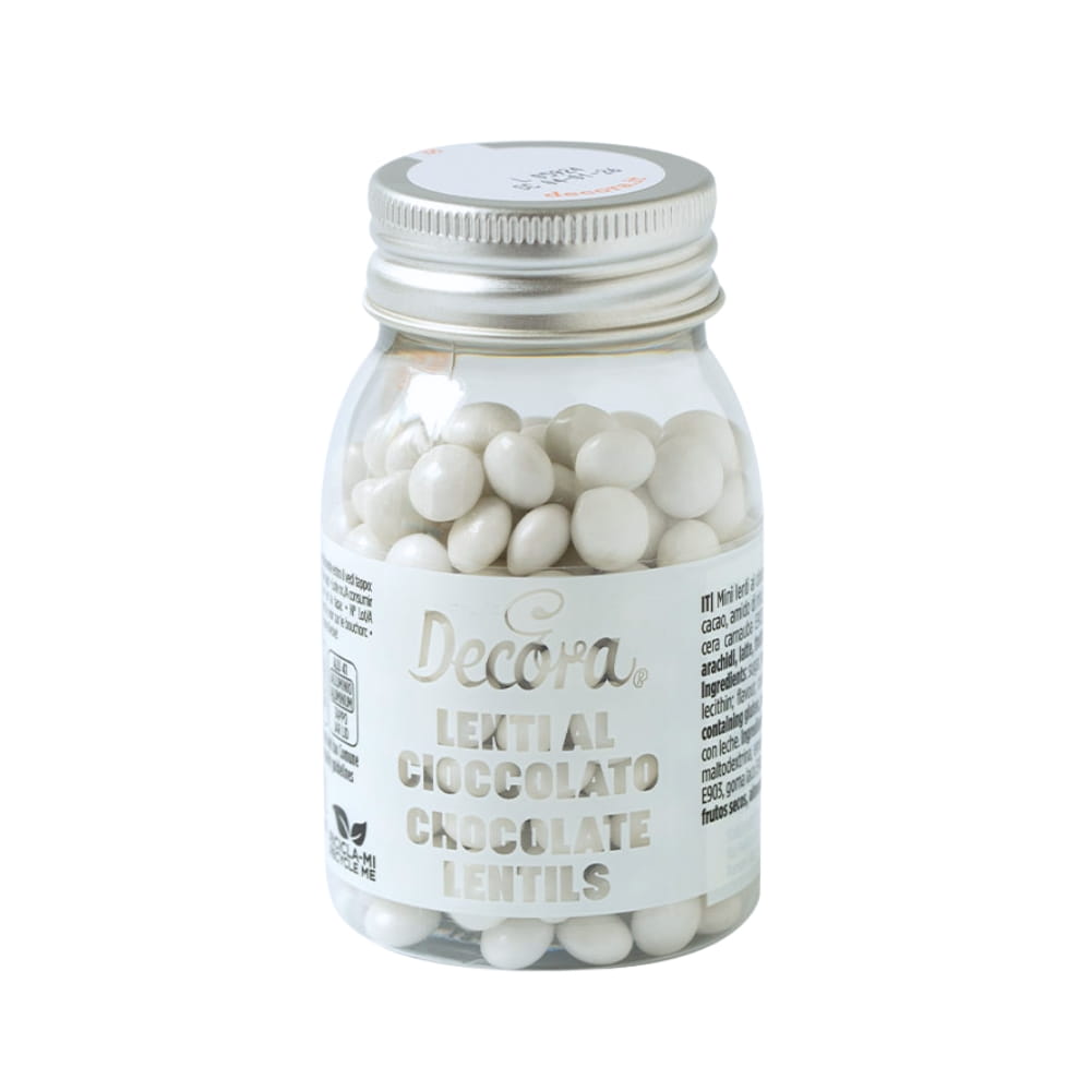 Lentilki to duże czekoladowe draże o spłaszczonym kształcie i chrupiącej cukrowej skorupce, która kryje pyszną, mleczną czekoladę. Śliczny i błyszczący biały kolor. Nieregularne Leniki mają kształt soczewki i średnicę 10 mm. To doskonała posypka do deserów, napojów z bitą śmietaną, lodów, tortów, babeczek, muffinek, monoporcji, cake pops i wszelkich wypieków. Używana także jako dodatek do wypieków, głównie kruchych ciasteczek, tabliczek czekolady, ozdoba słodkich stołów. Jej niepowtarzany kształt i kolorystyka pozwalają stworzyć romantyczne cukiernicze kreacje! Idealny pomysł na Komunię.