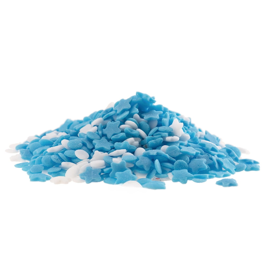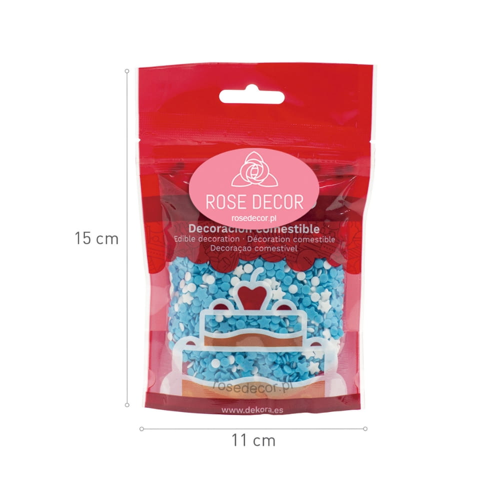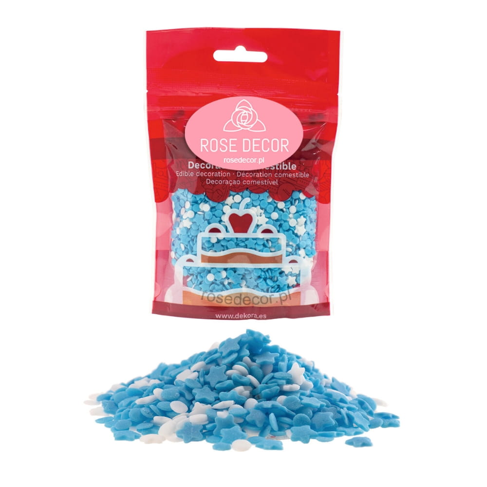 Posypka cukrowa to drobne konfetti w kształcie gwiazdek i pastylek (krążków). Dominuje niebieski, błękitny kolor, ale cześć gwiazdek i pastylek jest biała. Tworzy to piękną kompozycję różnych drobnych kształtów i kolorów. Pozwala ciekawie udekorować: torty, muffinki, ciasta desery, cake pops, ciasteczka, pierniczki i wszelkie rodzaju wypieki. Jadalna posypka na tort pozwala stworzyć zachwycające dekoracje. Doskonała do ozdabiania wypieków i słodkości związanych z chrztem, baby shower, urodzinami i imprezami dla dzieci. Duża dawka dziecięcego błękitu dla chłopców.