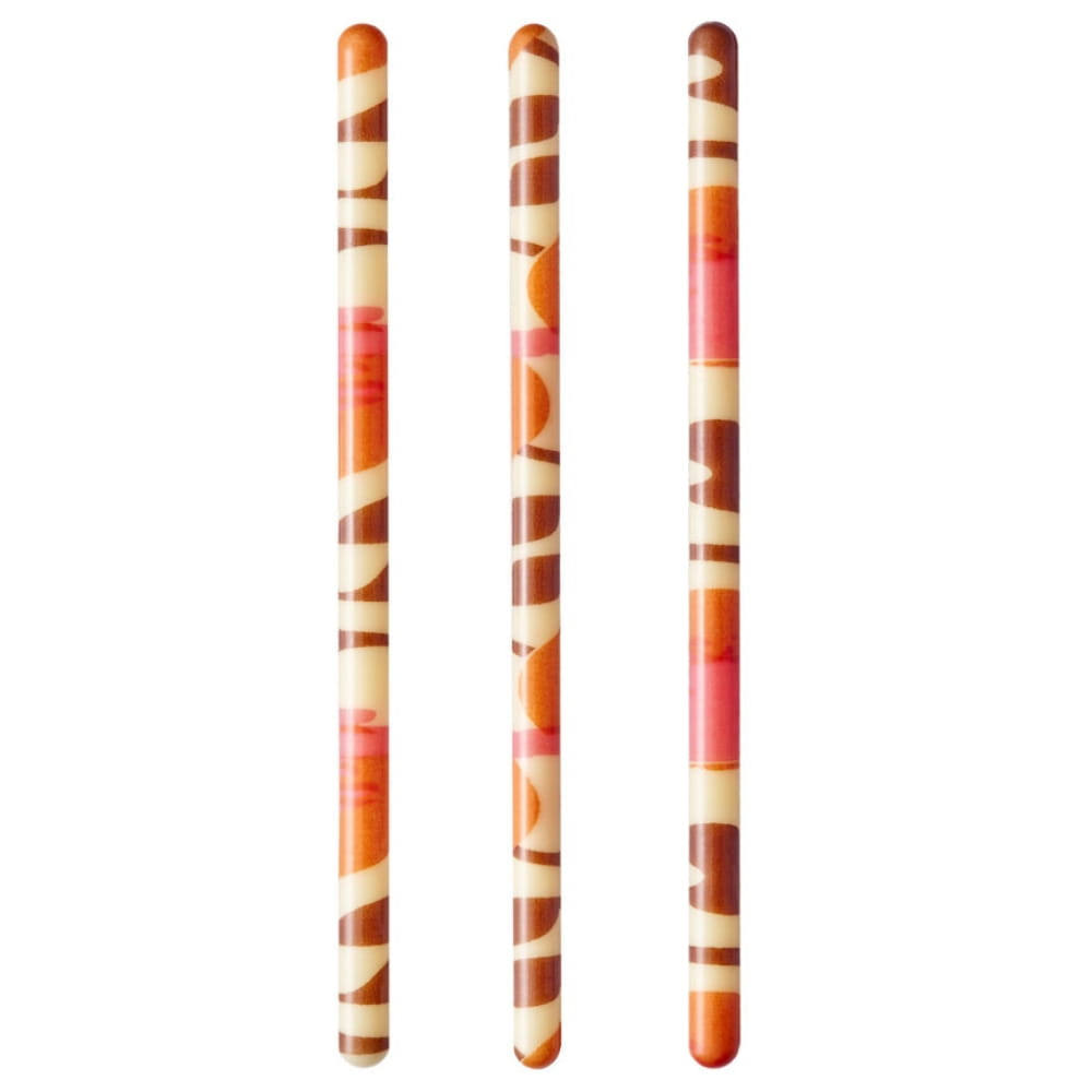 Bierka Tokyo to dekoracja wykonana z wysokiej jakości białej czekolady z kolorowym nadrukiem. W opakowaniu miks trzech pięknych abstrakcyjnych wzorów. Połączenie energetycznych kolorów i pełnego artyzmu designu kojarzy się z japońskim uwielbieniem dla ognistych barw i prostych, smukłych form. Prosta forma lśniącego patyczka o długości 135 mm i grubości 5 mm inspiruje do nieskończonej liczby kreatywnych dekoracji. Bierki Tokyo pozwalają łatwo i szybko tworzyć ciekawe cukiernicze dzieła: torty, desery, lody. Używane ponadto do dekorowania monoporcji, babeczek, muffinek, pucharów lodowych, kremów, wypieków, słodkości i wszelkich deserów.