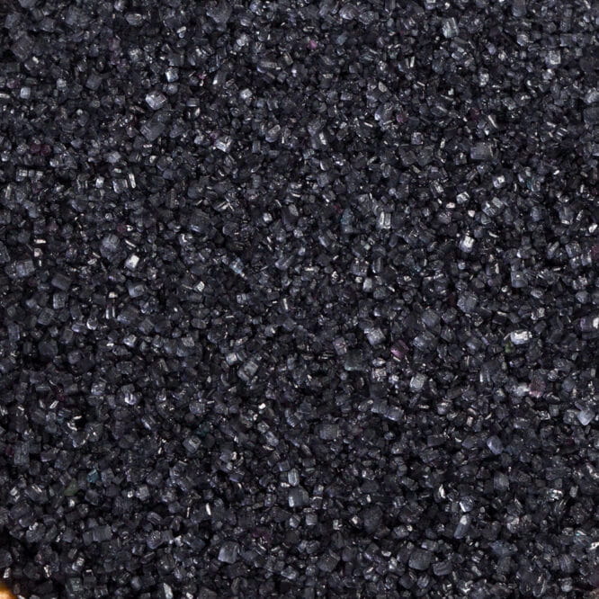 Posypka cukrowa o nieregularnym kształcie drobnych kryształków cukru w kolorze czarnym i twardej konsystencji. Kryształki są chrupiące i lśnią niczym małe kamyczki szlachetne. Wytwarzane na bazie cukru: mają słodki smak. Posypka ma postać bardzo drobnych, brokatowych kryształków. Nie wpływają na smak dekorowanych deserów. Posypka kryształkowa jest barwiona tylko środkami bezpiecznymi dla zdrowia, wolna od barwników azowych i E171. Produkt bezglutenowy. To bardzo uniwersalna posypka na każdą okazję. Idealnie sprawdzi się do dekoracji: ciasteczek, pierniczków, babeczek, muffinek, tortów, deserów, wypieków, cake pops, pralin, trufli, czekolady, lodów oraz wielu innych słodkich wyrobów. Można nią efektywnie udekorować kieliszki i szklanki.