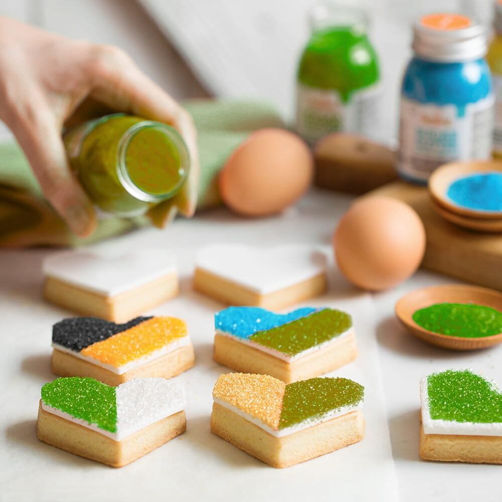 Posypka cukrowa o nieregularnym kształcie drobnych kryształków cukru w kolorze zielonym i twardej konsystencji. Kryształki są chrupiące i lśnią niczym małe kamyczki szlachetne. Wytwarzane na bazie cukru: mają słodki smak. Posypka ma postać bardzo drobnych, brokatowych kryształków. Nie wpływają na smak dekorowanych deserów. Posypka kryształkowa jest barwiona tylko środkami bezpiecznymi dla zdrowia, wolna od barwników azowych i E171. Produkt bezglutenowy. To bardzo uniwersalna posypka na każdą okazję. Idealnie sprawdzi się do dekoracji: ciasteczek, pierniczków, babeczek, muffinek, tortów, deserów, wypieków, cake pops, pralin, trufli, czekolady, lodów oraz wielu innych słodkich wyrobów. Można nią efektywnie udekorować kieliszki i szklanki.