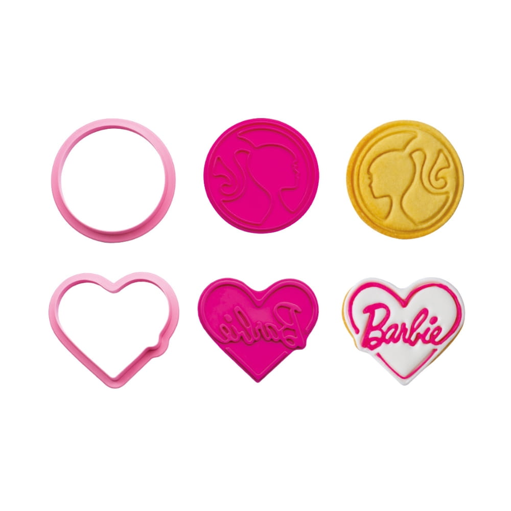 Forma do ciastek Barbie to zestaw dwóch wykrojników do wycinania i dwóch stempli do odciskania z super wzorami: charakterystycznym napisem "Barbie" i głową najsłynniejszej lalki świata. Jeden z wykrojników jest okrągły, drugi ma kształt słodkiego serduszka. Zestaw pozwala uformować cudowne ciasteczka, ozdoby z masy cukrowej, marcepanu lub pierniczki ozdobione po obu stronach wypukłym reliefem! Można też tworzyć kolorowe dekoracje z masy cukrowej! Stworzone w ten sposób dekoracje są idealne do malowania, pokrywania, ozdabiania i lukrowania. Świetny pomysł na Walentynki, imprezę dla dziewczynek czy baby shower.
