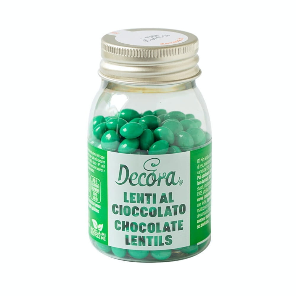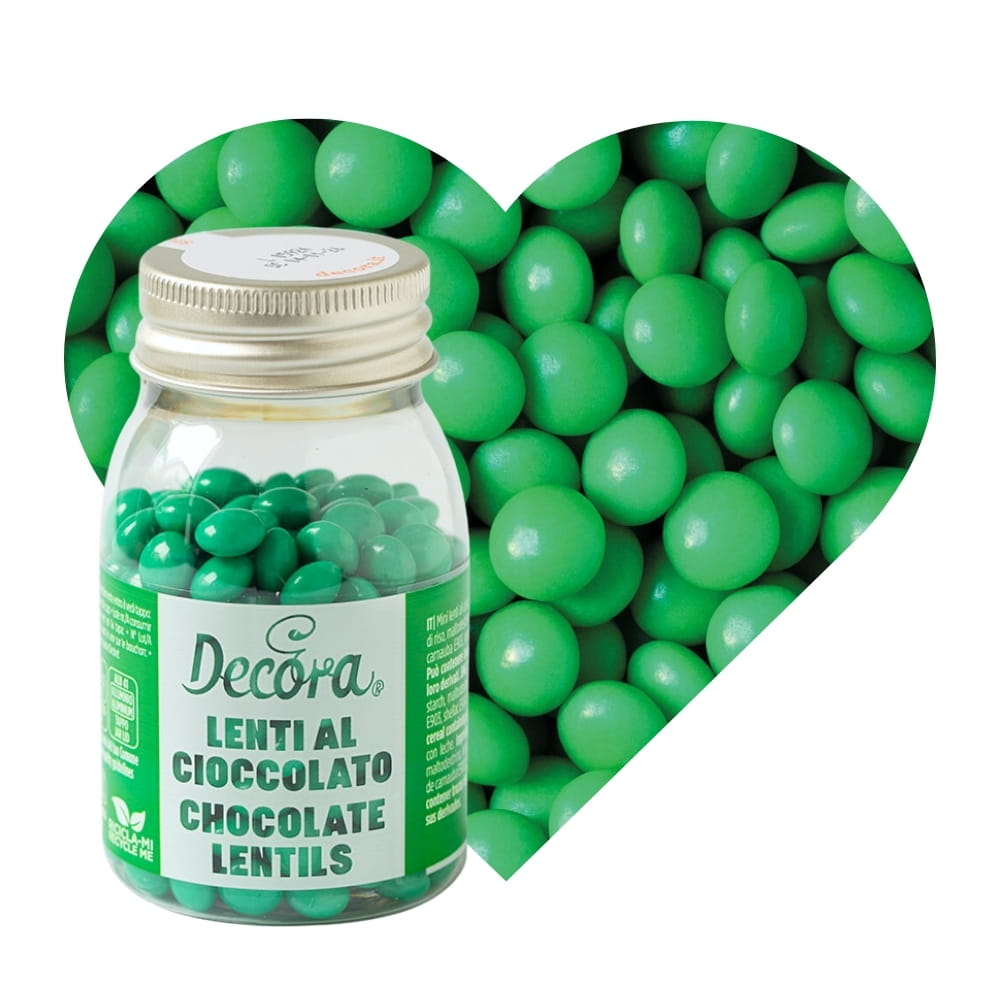 Lentilki to duże czekoladowe draże o spłaszczonym kształcie i chrupiącej cukrowej skorupce, która kryje pyszną, mleczną czekoladę. Śliczny i błyszczący intensywnie zielony kolor. Nieregularne Leniki mają kształt soczewki i średnicę 10 mm. To doskonała posypka do deserów, napojów z bitą śmietaną, lodów, tortów, babeczek, muffinek, monoporcji, cake pops i wszelkich wypieków. Używana także jako dodatek do wypieków, głównie kruchych ciasteczek, tabliczek czekolady, ozdoba słodkich stołów. Jej niepowtarzany kształt i kolorystyka pozwalają stworzyć romantyczne cukiernicze kreacje! Idealny pomysł na Urodziny i Święta.