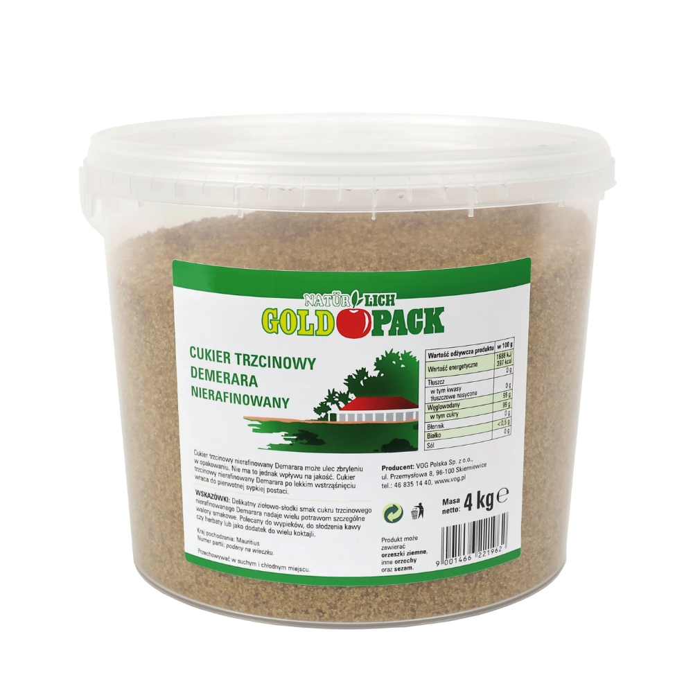 Cukier trzcinowy nierafinowany Demerara ma postać dużych złotobrązowych kryształków i karmelowy aromat. Pochodzi z pierwszego wirowania soku z trzciny cukrowej, dzięki czemu zawiera naturalną melasę, jest lekko wilgotny i ma głębszy smak niż biały cukier. To znacznie zdrowszy i bardziej naturalny zamiennik dla białego cukru buraczanego. Doskonały do wypieków, deserów oraz słodzenia ciepłych napojów, kawy, herbaty. Niezastąpiony w daniach kuchni azjatyckiej i drinkach. Na produkcie tym nie jest wymagane podawanie daty o minimalnej trwałości. W ekonomicznym wiaderku 4 kg.