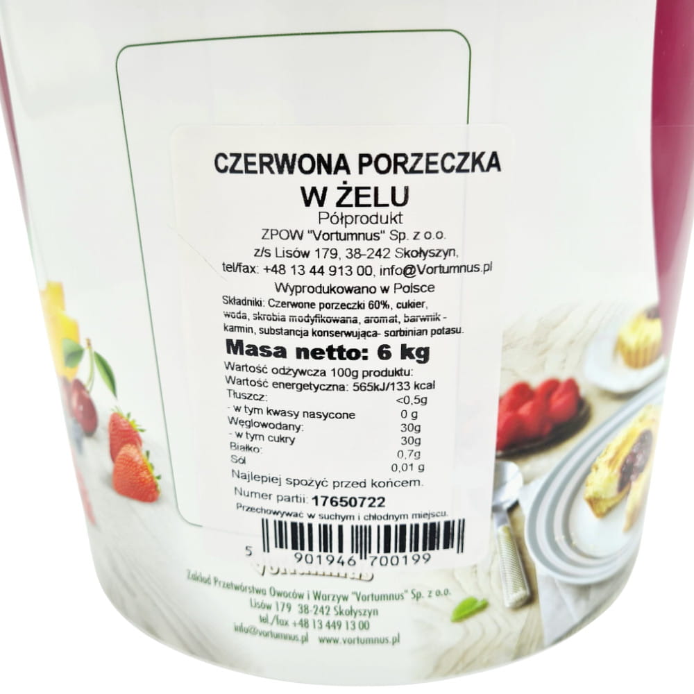 Owoce czerwonej porzeczki zanurzone w delikatnym żelu, z dodatkiem składników wzmacniających smak i aromat. Produkt zawiera aż 60% owoców, które zachowały swój smak i świeżość. Masa żelowa, która powstaje z połączenia owoców, cukru, skrobi i regulatora kwasowości ma bardzo wiele zastosowań w cukiernictwie. Owoce w żelu mają słodki i naturalny smak. Charakteryzuje je doskonała termostabilność, można je zamrażać i piec w temperaturze 200-230°C przez 15 - 20 minut bez utraty połysku!