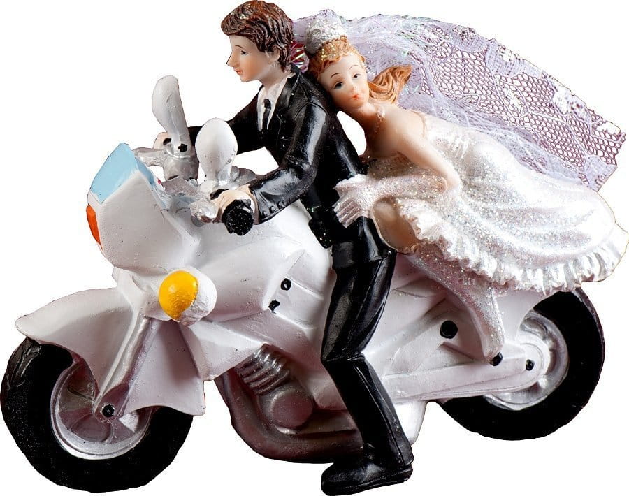 Figurka na tort weselny wykonana z tworzywa sztucznego, kolorowa. Doskonała dekoracja tortu weselnego lub stołu. Niezwykle efektowna figurka z lekkim humorem przedstawia parę na sportowym motorze: ścigaczu. Ta trwała figurka, może stanowić niepowtarzalną pamiątkę tej wyjątkowej uroczystości. Biały motor ładnie komponuje się z bielą sukni ślubnej i podkreśla wyjątkowy wymiar uroczystości. Wymiary figurki: 13,5 × 11,5 cm.