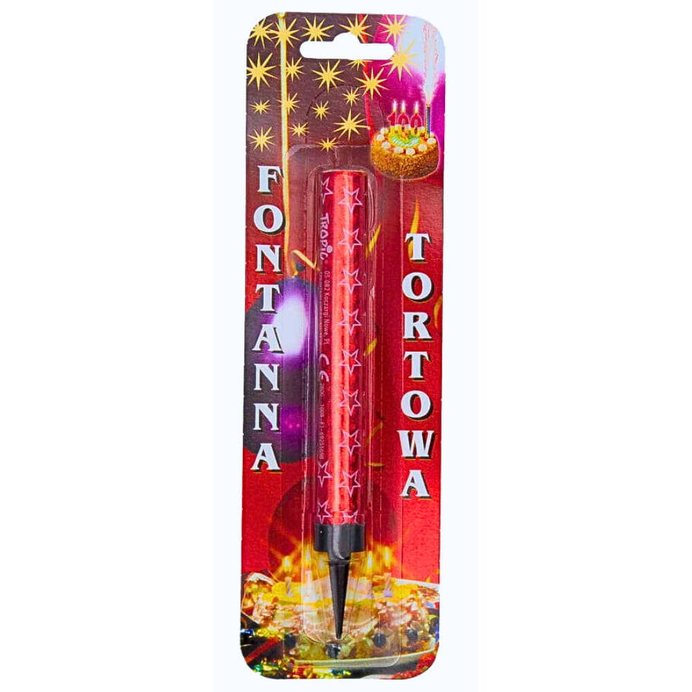 Fontanna na tort to efektowna ozdoba, dzięki której każdy tort stanie się atrakcją wydarzenia. Wystarczy umieścić fontannę na torcie, odpalić i cieszyć się jej blaskiem. Fontanna posiada plastikową nóżkę ze szpikulcem do wbicia na tort. Pali się czerwonym płomieniem. Czas palenia: 60 sekund. Idealna na urodziny, roczek, baby shower, komunię, wesele i wszelkie inne uroczystości, którym chcemy dodać iskier! Pojedyncza fontanna zapakowana w blister.
