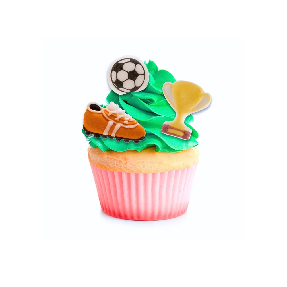 Figurki cukrowe w kształcie zestawu piłkarskiego. To gotowa do użycia dekoracja z masy cukrowej. W skład zestawu wchodzi aż 8 elementów: 4 buty piłkarskie korki w dwóch kolorach, dwie czarno-białe piłki, czerwony gwizdek i złoty puchar. Ozdoby wykonywane są ręcznie i barwione przy pomocy naturalnie pozyskiwanych barwników. Idealne do ozdabiania tortów, muffinek, babeczek, ciasteczek, deserów, ciast i wypieków. Wspaniały pomysł na ozdobienie słodkości dla prawdziwego fana piłki nożnej! Kolorystyka i forma chętnie wykorzystywana do dekoracji tematycznych związanych urodzinami i dniem chłopaka.