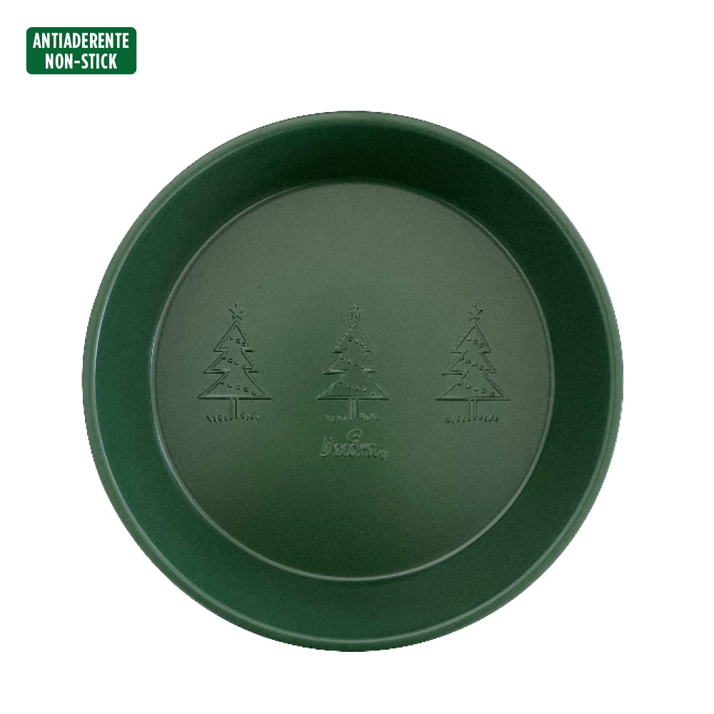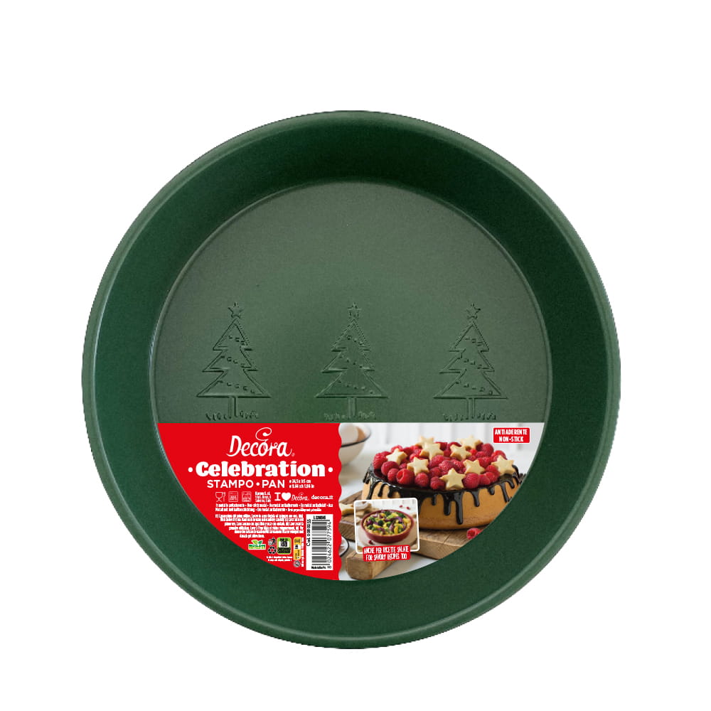 Forma do pieczenia profesjonalna okrągła forma o średnicy 24,5 cm wykonana z wysokiej jakości, nieprzywierającego metalu w kolorze świątecznej zieleni. Dno ozdobione trzema choinkami. Idealna do pieczenia deserów i niskich ciast, zarówno słodkich jak i słonych. Proste krawędzie gwarantują tworzenie nieskazitelnych ciast. Zaleca się każdorazowo smarować formę przed użyciem. To wspaniały pomysł na stworzenie magicznej atmosfery Świąt! Forma szybko i równomiernie się nagrzewa, nie przywiera do ciasta i jest łatwa w czyszczeniu.