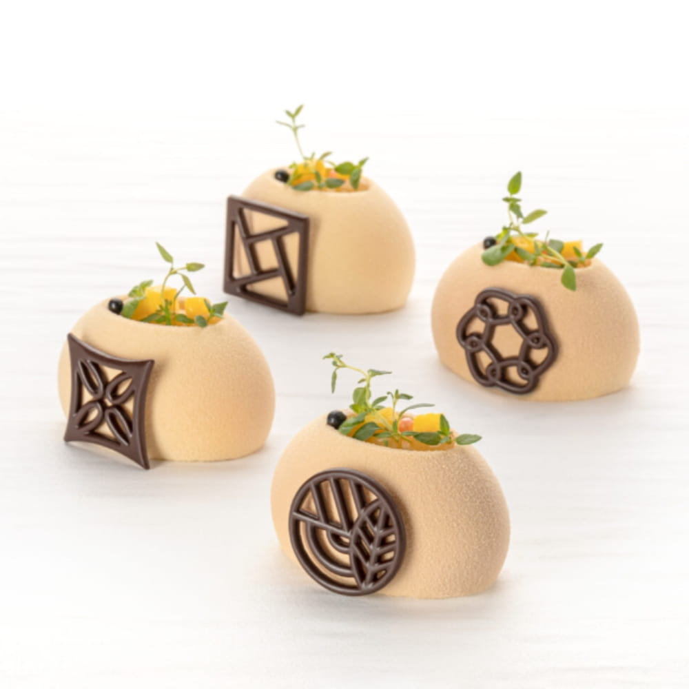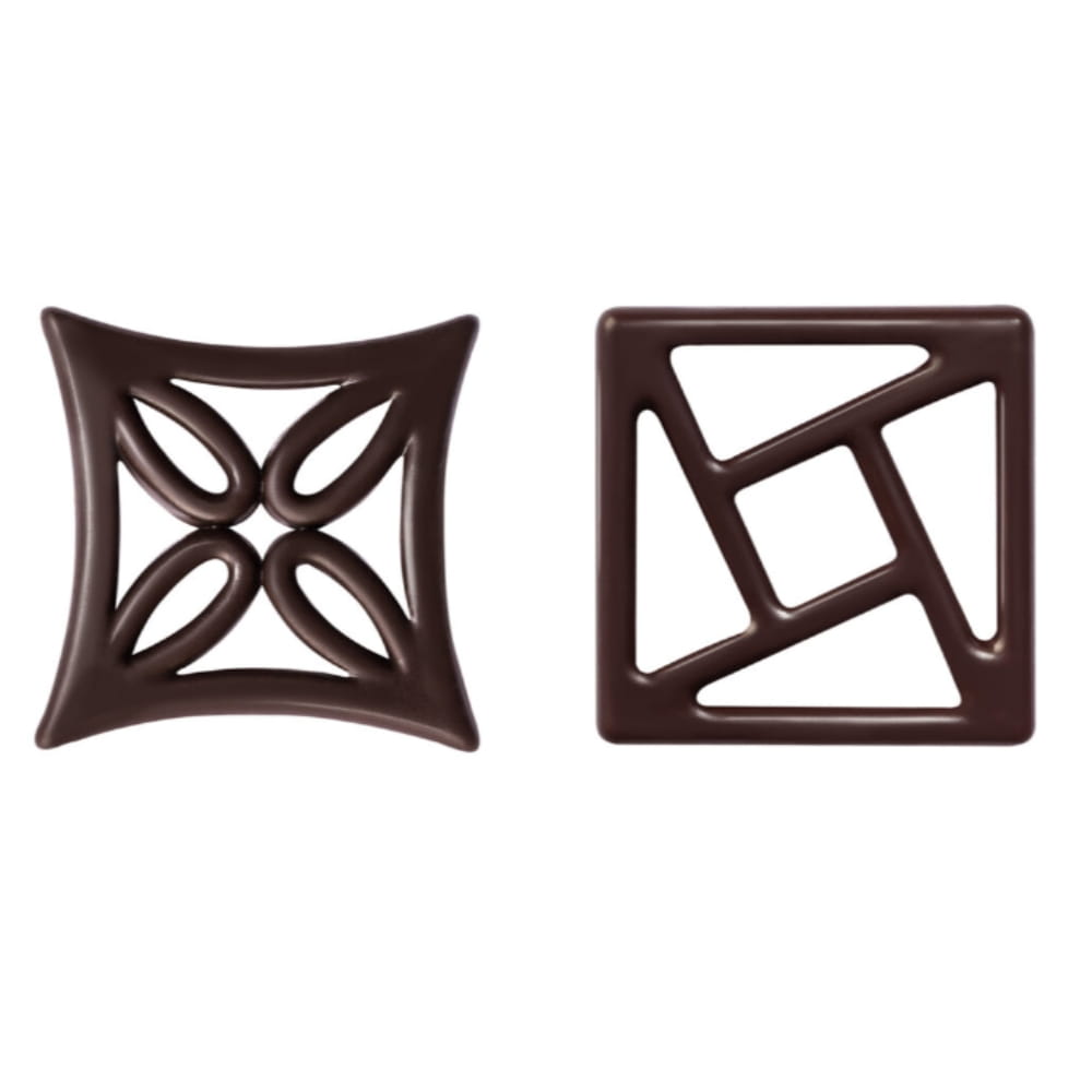 Harmonia to zestaw eleganckich ażurków wykonanych z wysokiej jakości ciemnej czekolady deserowej. Dekoracje w kształcie kwadratu oraz karo, z delikatnymi geometrycznymi wzorami. Te piękne, ażurowe dekoracje dodadzą lekkości i artyzmu wszelkim dekorowanym wyrobom. Ciemnoczekoladowe ażurki z zestawu Harmonia idealnie sprawdzą się na nowoczesnych monoporcjach, tortach i pralinach. Używane także do dekorowania babeczek, mufiinek, pucharów lodowych, kremów, wypieków, słodkości i wszelkich deserów. W opakowaniu miks: dwa geometryczne, ażurowe wzory.