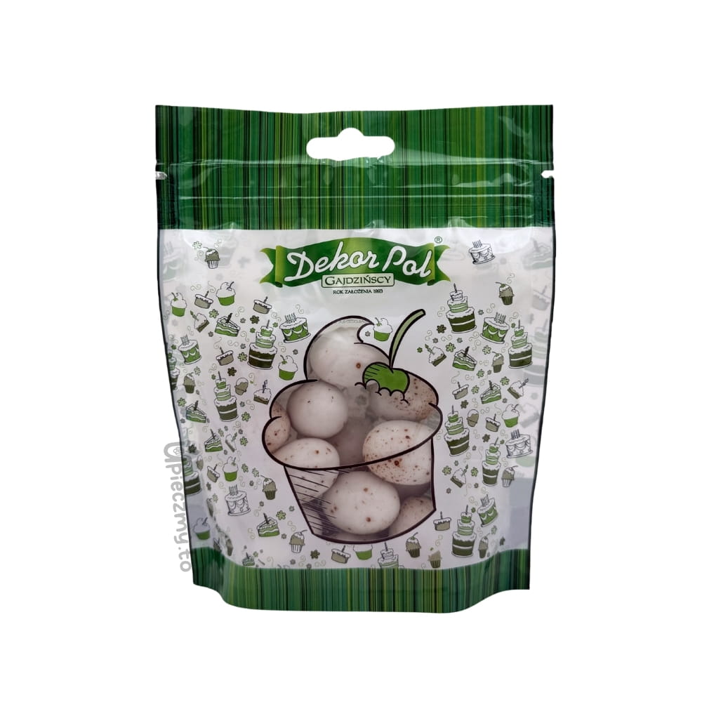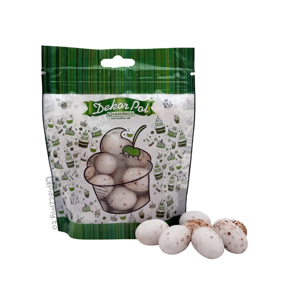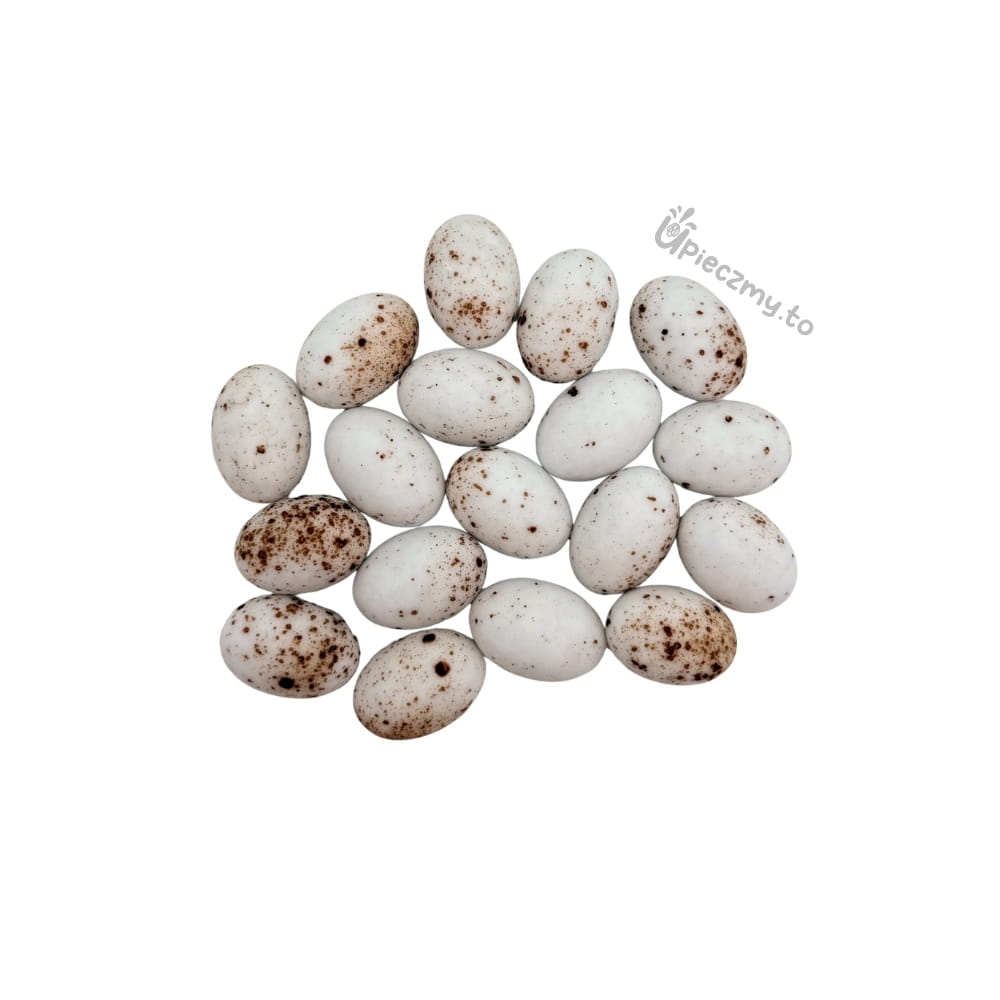 Czekoladowe jajka to duże czekoladowe draże w kształcie jajek o wysokości 30 mm. Pod chrupiącą, nakrapianą białą skorupką, kryje się czekoladowe nadzienie z nutą orzechową. Jajeczka mają śliczne biały kolor i są gęsto nakrapiane plamkami. Idealne do koszyczka! Doskonale sprawdzą się na wielkanocnych wypiekach i deserach, lodach, dodadzą niesamowitego uroku słodkim ciasteczkom, babeczkom i muffinkom. To wspaniały pomysł na urozmaicenie dekoracji na wielkanocnym stole.