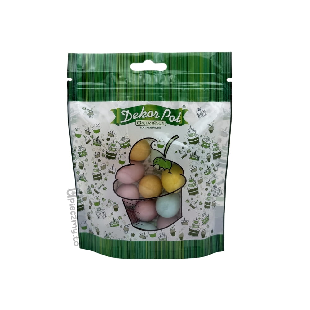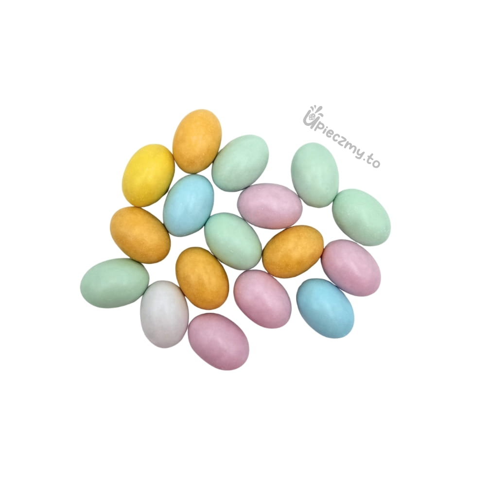 Czekoladowe jajka to duże czekoladowe draże w kształcie jajek o wysokości 30 mm. Pod chrupiącą, bajecznie kolorową skorupką kryje się czekoladowe nadzienie z nutą orzechową. Jajeczka mają śliczne pastelowe kolory, utrzymane w klimacie Świąt Wielkanocnych. Idealne do koszyczka! Doskonale sprawdzą się na wielkanocnych wypiekach i deserach, lodach, dodadzą niesamowitego uroku słodkim ciasteczkom, babeczkom i muffinkom. To wspaniały pomysł na urozmaicenie dekoracji na wielkanocnym stole. W opakowaniu mix kolorów.