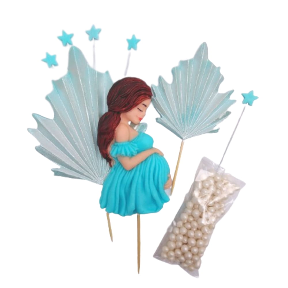 Figurki cukrowe w kształcie kobiety w ciąży w niebieskiej sukience z dodatkiem błękitnych wachlarzy, pikerów gwiazdek i posypki w postaci białych perełek. To gotowa do użycia dekoracja z masy cukrowej. W skład zestawu wchodzi aż 9 elementy: figurka piker dziewczyny w ciąży, dwa niebieskie wachlarze, 5 pikerów niebieskich gwiazdek i 60 szt białych perełek o średnicy 5 mm do posypania. Zestaw stanowi przemyślaną tematyczną całość i praktycznie tworzy całość dekoracji na torcie. Wymiary kobiety to 9,5 × 5 cm, wachlarze 10 × 5 i 7 × 6 cm, pikery gwiazdki mają 20 cm wraz z patyczkami. Patyczki bardzo ułatwiają unieruchomienie figurek, wystarczy je wbić w tort. Idealne do ozdobienia tortu, deseru i innych wypieków. Dekoracje są jadalne i barwione spożywczymi, bezpiecznymi farbkami. Każdy zestaw jest wykonywany ręcznie, a przez to wyjątkowy i niepowtarzalny, dlatego może minimalnie różnić się od tego przedstawionego na zdjęciu. Wspaniały pomysł na ozdobienie tortu z okazji Baby Shower, niebieski motyw dobrany z myślą o chłopcach.