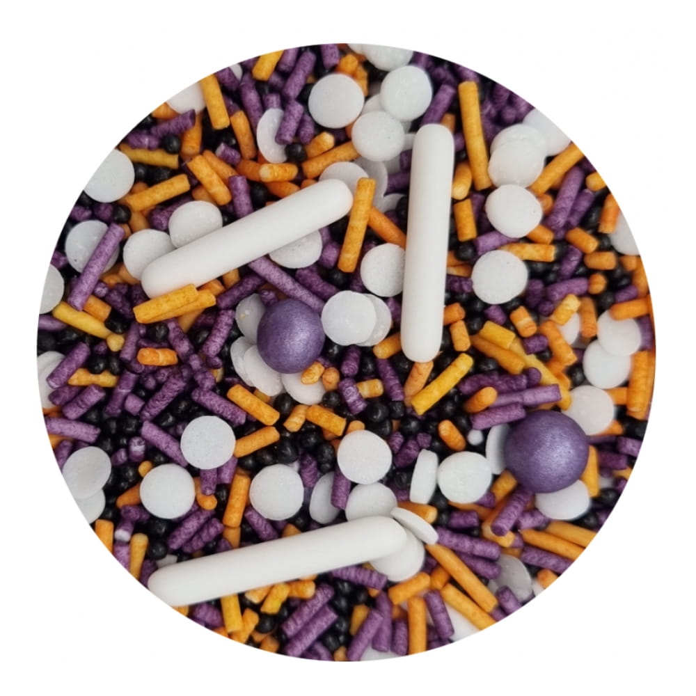 Posypka cukrowa Halloween 3 to fantastyczna gotowa kompozycja w poręcznym zamykanym pojemniczku. W skład starannie wyselekcjonowanej kompozycji wchodzą: białe podłużne makaroniki (grube zaokrąglone pałeczki), duże fioletowe perełki, białe krążki (forma małych pastylek), cudowne fioletowe i pomarańczowe patyczki i drobne czarne maczki. Całość zapewnia bardzo halloweenową kolorystykę. Niezwykłe połączenie różnych kształtów: lśniących perełek, podłużnych patyczków, grubszych makaroników i drobniejszych maczków tworzy wspaniały, przebogaty efekt. Pozwala ciekawie udekorować: torty, muffinki, ciasta desery, cake pops, ciasteczka, pierniczki i wszelkie rodzaju wypieki. Możemy stworzyć zachwycające dekoracje, doskonałe do ozdabiania urodzinowych i halloweenowych tortów, wypieków i wszelkich słodkości związanych z nastrojem bajkowych potworów.