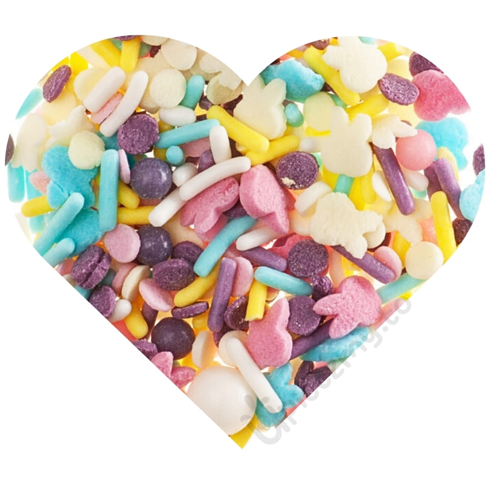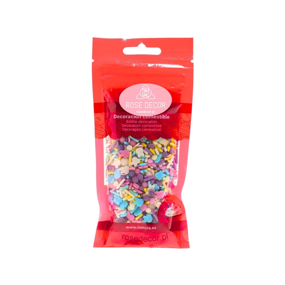 Posypka cukrowa z króliczkami to fantastyczna gotowa kompozycja w poręcznym blisterze. W skład starannie wyselekcjonowanej kompozycji wchodzą: kremowe, różowe i niebieskie króliczki (uszate główki), duże białe perełki, mniejsze perełki (żółte, różowe, fioletowe, białe), pałeczki (żółte, fioletowe, niebieskie, białe). Całość zapewnia bardzo dziecięcą, bajkową kolorystykę. Niezwykłe połączenie różnych kształtów: figurek, lśniących perełek, podłużnych patyczków i drobniejszych kuleczek tworzy wspaniały, przebogaty efekt. Pozwala ciekawie udekorować: torty, muffinki, ciasta desery, cake pops, ciasteczka, pierniczki i wszelkie rodzaju wypieki. Możemy stworzyć zachwycające dekoracje, doskonałe do ozdabiania urodzinowych, dziecięcych tortów, wypieków i słodkości dla dzieci, czy słodkości związanych z baby shower, chrzcinami.