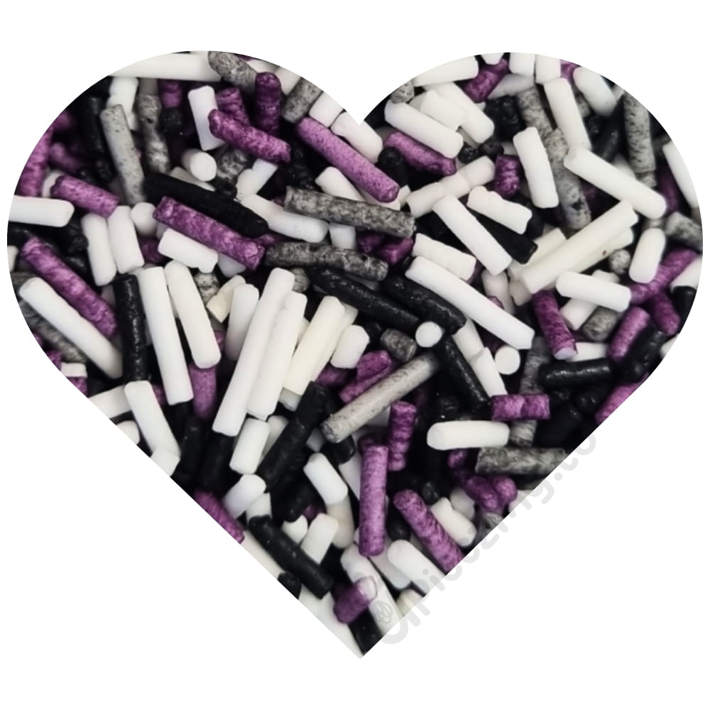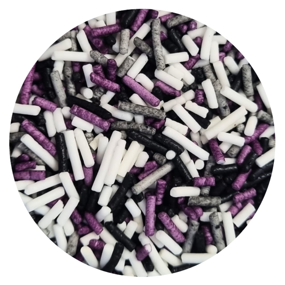 Pałeczki to malutkie twarde patyczki z masy cukrowej. Te kolorowe drobne patyczki w nastrojowym mixie idealnym na Halloween to prawdziwa królowa wśród posypek. Cztery kolory: szary, biały, czarny i fioletowy tworzą nastrojową kompozycję. To drobna posypka cukrowa o twardej, chrupiącej konsystencji. Posypka w tej postaci jest bardzo uniwersalna. Idealna do dekoracji babeczek, ciasteczek, pierniczków, muffinek, tortów, deserów, wypieków, cake pops, pralin, trufli, czekolady, lodów oraz wielu innych słodkich wyrobów, zwłaszcza tych z kremami i polewami. Czy jest ktoś, kto jej nie próbował? Zawsze warto postawić na klasykę: produkt po prostu obowiązkowy przy tworzeniu donutów i domowych lizaków z ciasta. Idealna mieszanka na Halloween!