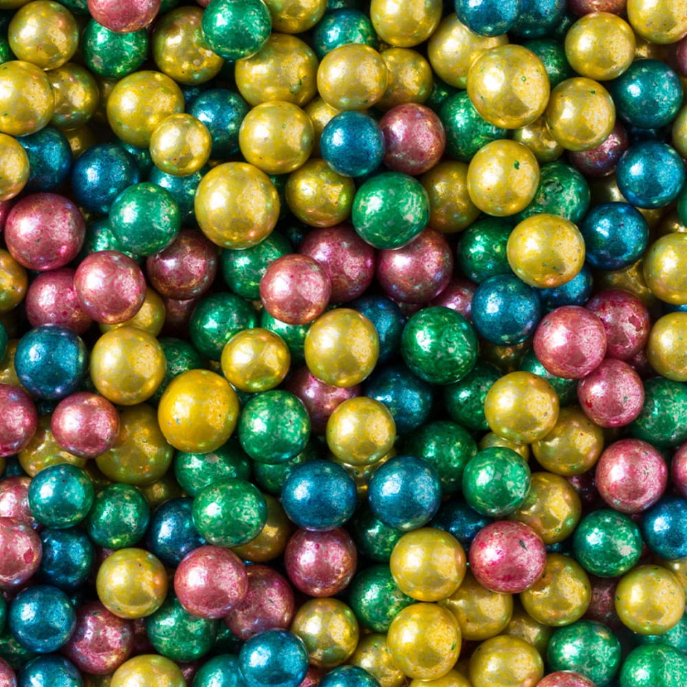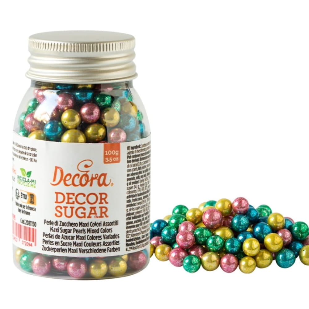 Perełki to większe okrągłe kuleczki. Mają piękny, świecący metaliczny kolor i 7 mm średnicy! W mixie można wyróżnić 4 barwy: zieloną, złotą, niebieską i różową. To błyszcząca, cukrowa posypka z metalicznej linii wyjątkowych produktów od włoskiej Decory. Nie wpływa na zmianę smaku dekorowanych wyrobów, jest wykonana z naturalnych barwników i ma smak masy cukrowej. To bardzo uniwersalna posypka, idealna do dekoracji babeczek, ciasteczek, pierniczków, muffinek, tortów, deserów, wypieków, cake pops, pralin, trufli, czekolady, lodów oraz wielu innych słodkich wyrobów, zwłaszcza tych z kremami i polewami. Sprawdzi się na każdą okazję: ślub, komunię, karnawał, urodziny, dzień matki i wiele innych. Zapakowana w praktyczny zakręcany słoiczek.
