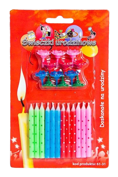Świeczki urodzinowe w najbardziej klasycznym wydaniu: 4 kolory i słodkie kropki na całej długości. Must have każdych urodzin. W opakowaniu 12 świeczki wraz z kolorowymi podstawkami w kształcie kwiatuszka. Świeczki w 4 kolorach: zielonym, różowym, niebieskim i czerwonym. Te uniwersalna świeczki idealnie się sprawdzą na tortach, torcikach urodzinowych, bento cakes, deserach, zestawach lodowych i wszystkich innych słodkościach. Sam ich wygląd od razu przywodzi na myśl urodzinowe zdmuchiwane świeczek! W blisterze 12 świeczek wraz z podstawkami.