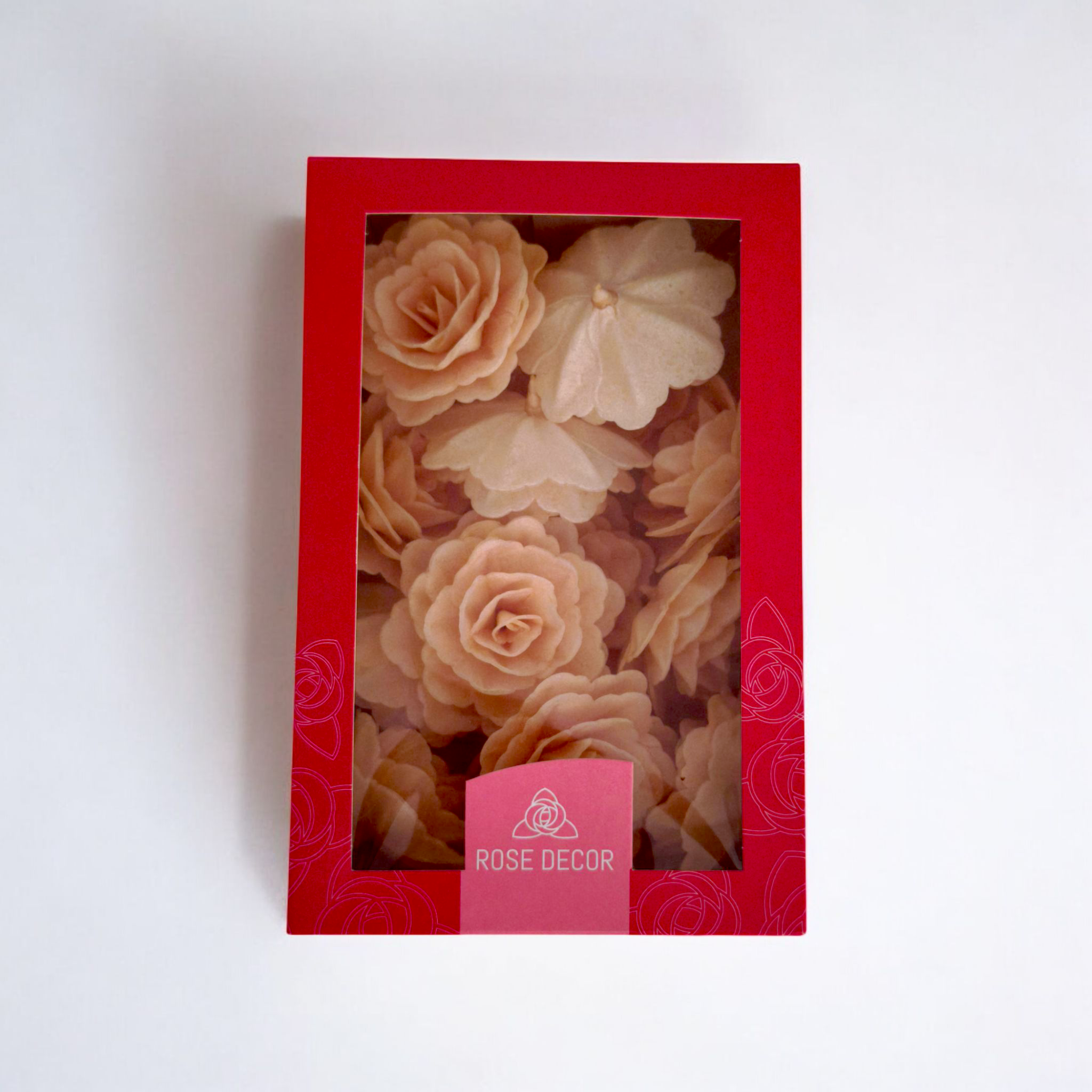 Róża opłatkowa chińska to efektowna, gotowa dekoracja w kształcie kwiatu wykonana z papieru waflowego. Jadalna i lekka, piękna pudrowa róża chińska, będzie stanowić wyjątkową ozdobę tortu z każdej okazji: urodzin, imienin, chrztu czy ślubu. Z powodzeniem może posłużyć do dekoracji pozostałych wypieków, słodkości i innych wyrobów cukierniczych. Waflowe kwiaty na tort zapewniają niepowtarzalny wygląd, a do tego są bardzo szybkie i łatwe w użyciu. Można z nich ułożyć bukiet, kwiatową kompozycję, łączyć z innymi dekoracjami lub używać pojedynczo. W eleganckim pudełku znajduje się 15 pudrowych róż chińskich o średnicy 70 mm.
