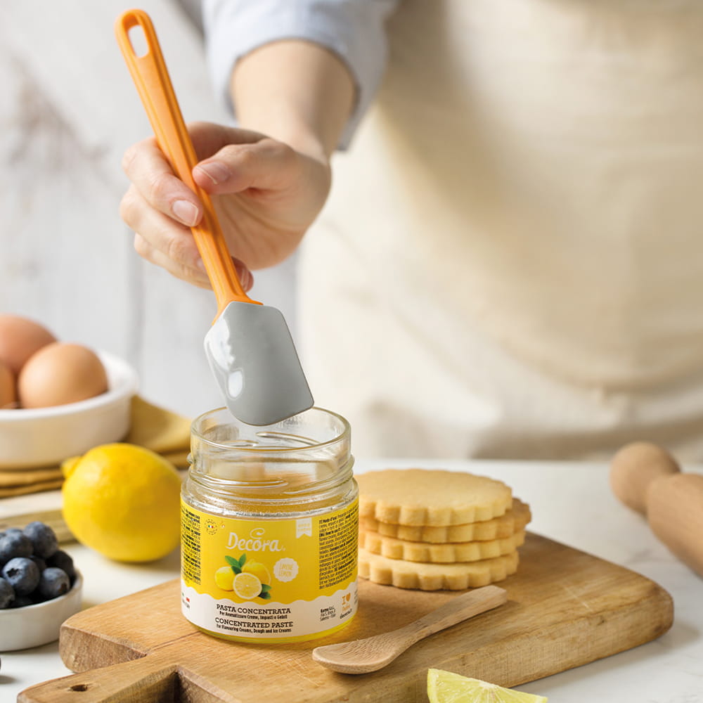Łopatka kuchenna wykonana z najwyższej jakości silikonu Platinum od renomowanej włoskiej marki Decora. Jest to najlepszy z silikonów dopuszczonych do kontaktu z żywnością. Rączka z tworzywa sztucznego z wygodną zawieszką. Łopatka ma wymiary 3,5 na 5 cm i jeden róg zaokrąglony, a drugi kwadratowy do wygodnego wybierania ciasta z różnych naczyń. Zastosowany silikon jest elastyczny, wytrzymały i nie traci kształtu nawet po wielu użyciach. Niezwykle wygodna podczas mieszania, rozkładania, nakładania i wybierania ciasta i kremu łopatka.