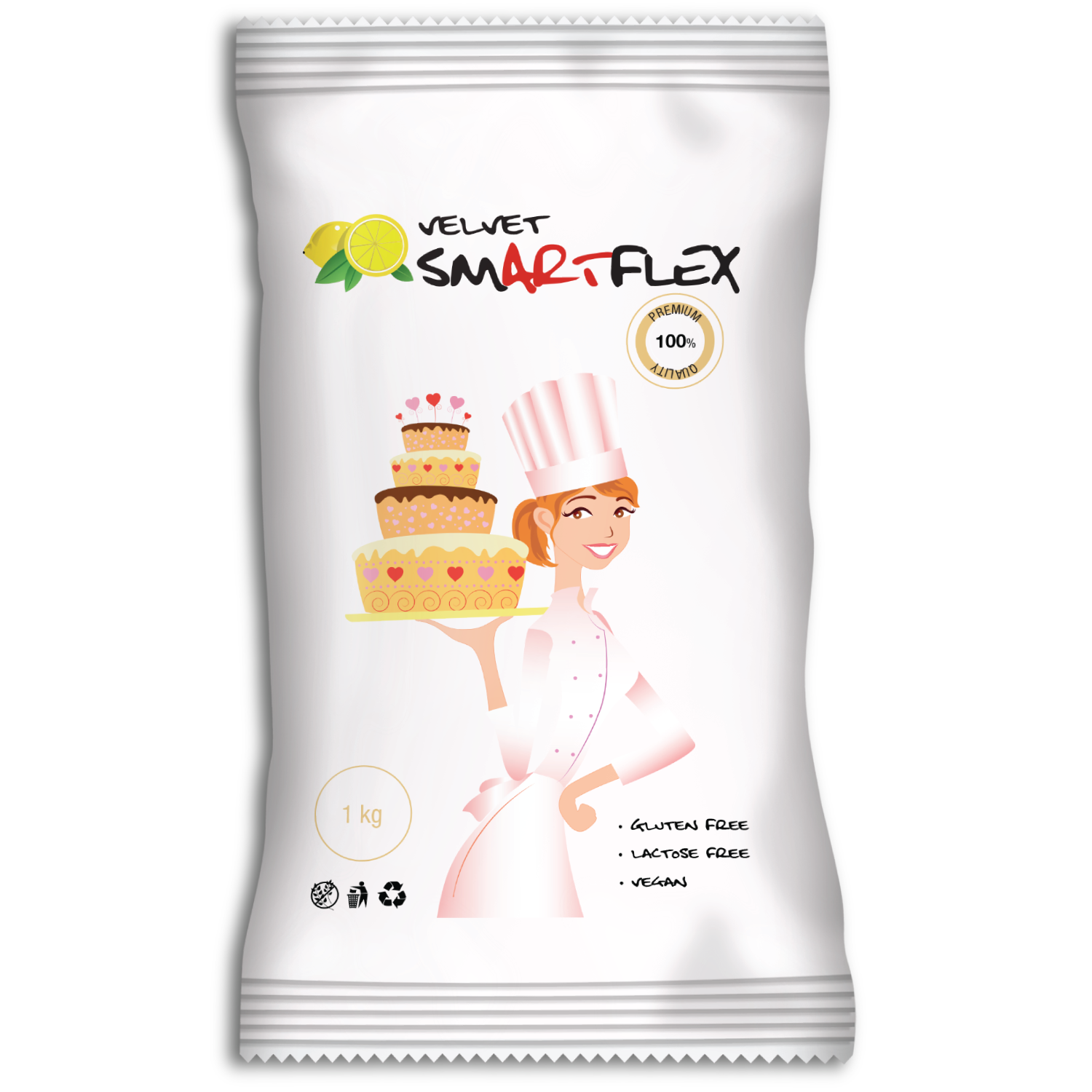 Masy cukrowe marki SmartFlex nie zawierają żadnych alergenów. Mogą je bezpiecznie spożywać osoby wrażliwe lub nietolerujące laktozy albo glutenu. Masy nie zawierają glutenu, laktozy ani alergenów. Nie zawiera orzechów ani nabiału. Odpowiednia dla wegan i wegetarian. Po prostu czysta etykieta, żeby każdy mógł cieszyć się wyjątkowymi tortami.