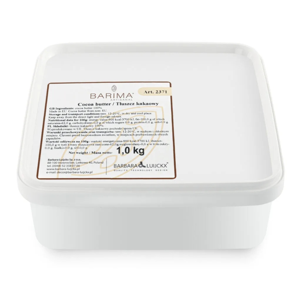 Masło kakaowe to podstawowy surowiec każdego kreatywnego mistrza czekolady. Czyste masło kakaowe uzyskiwane z pełnych, prażonych ziaren kakaowca — o neutralnym smaku i kolorze. W postaci wygodnych do używania i odmeirzania pastylek o średnicy 8 mm. Przeznaczone do produkcji i upłynniania czekolady. Sprawdzi się jako dodatek podczas tworzenia cienkich korpusów czekoladowych. Stanowi doskonałą bazę do rozpuszczania barwników spożywczych do czekolady. Dodanie od 1% do 8% masła kakaowego do całkowitej objętości czekolady sprawi, że będzie ona rzadsza, płynniejsza i doskonała do oblewania. Wysoka zawartość masła kakaowego w czekoladzie zapewnia jej odpowiednią chrupkość i pozwala uzyskać błyszczącą powierzchnię. Czekolada z dodatkiem masła, czyli kuwertura czekoladowa, doskonale sprawdzi się do tworzenia deserów, batonów, tabliczek, figurek, dekoracji czy polew. Masło przed użyciem należy zatemperować: najlepiej je upłynnić w kąpieli wodnej, w temperaturze 30-33°C.