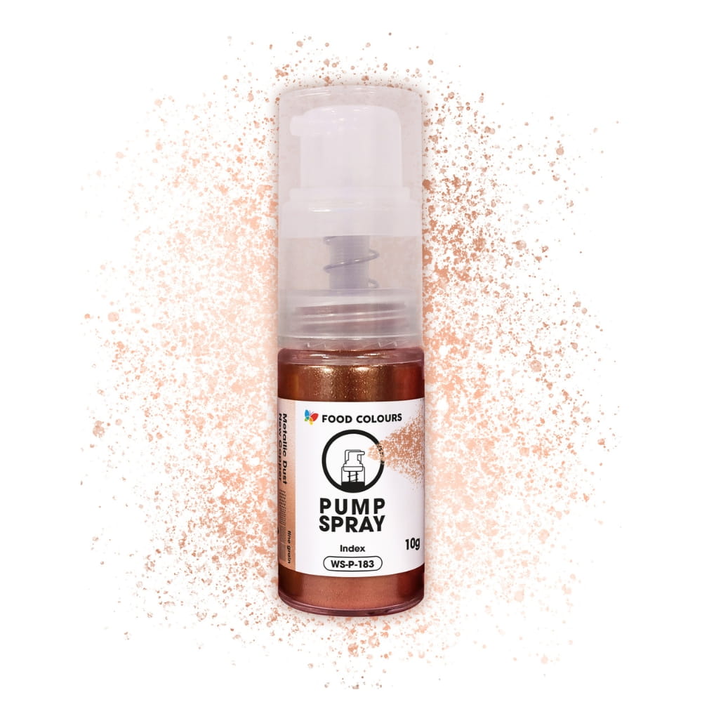 Miedziany pyłek w postaci suchego sprayu, który tworzy efekt metalicznego połysku na dekorowanych powierzchniach. Dust to bardzo drobny satynowy puder, gdzie blask nadają bardzo drobno zmielone drobinki. Idealny produkt do spektakularnego wykończenia cukierniczych dzieł. Można nim dekorować powierzchnie i masy, kremy, torty, marcepan, formy do pralin, dekoracje cukrowe, żele, czekoladki, dekoracje cukrowe i praktycznie wszystkie produkty cukiernicze. Dzięki pompce jest bardzo łatwy i wygodny w stosowaniu, także w domowych warunkach.