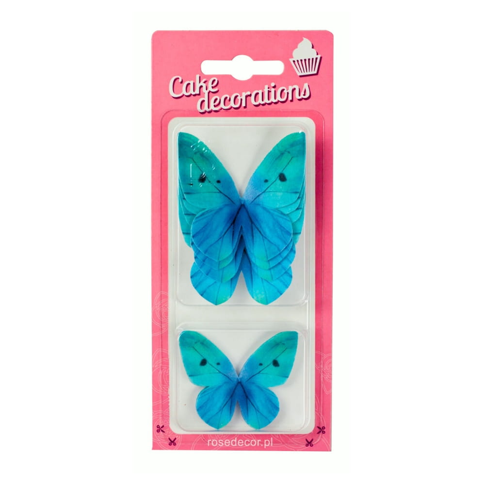 Turkusowe motyle to efektowna ozdoba waflowa w kształcie motylka wykonana z opłatka. Zestaw pięknych motylków w turkusowym połączeniu zieleni i niebieskiego. Wygląd turkusowych motyli jest niepowtarzalny. Ozdoba jest bardzo łatwa w użyciu, lekka i oczywiście w 100% jadalna. Pozwala na stworzenie subtelnych, ulotnych dekoracji na tortach, przystawkach, wypiekach i wyrobach cukierniczych. Motyle mają bardzo delikatną strukturę. Wyroby powinno się dekorować tuż przed podaniem. Motylkowe ozdoby waflowe silnie pochłaniają wilgoć. Delikatne złożenie skrzydeł motylka pozwala uzyskać efekt 3D. Mają neutralny smak: nie wpływają na smak dekorowanych wyrobów. W opakowaniu 4 sztuki większe i 4 mniejsze (łącznie 8).