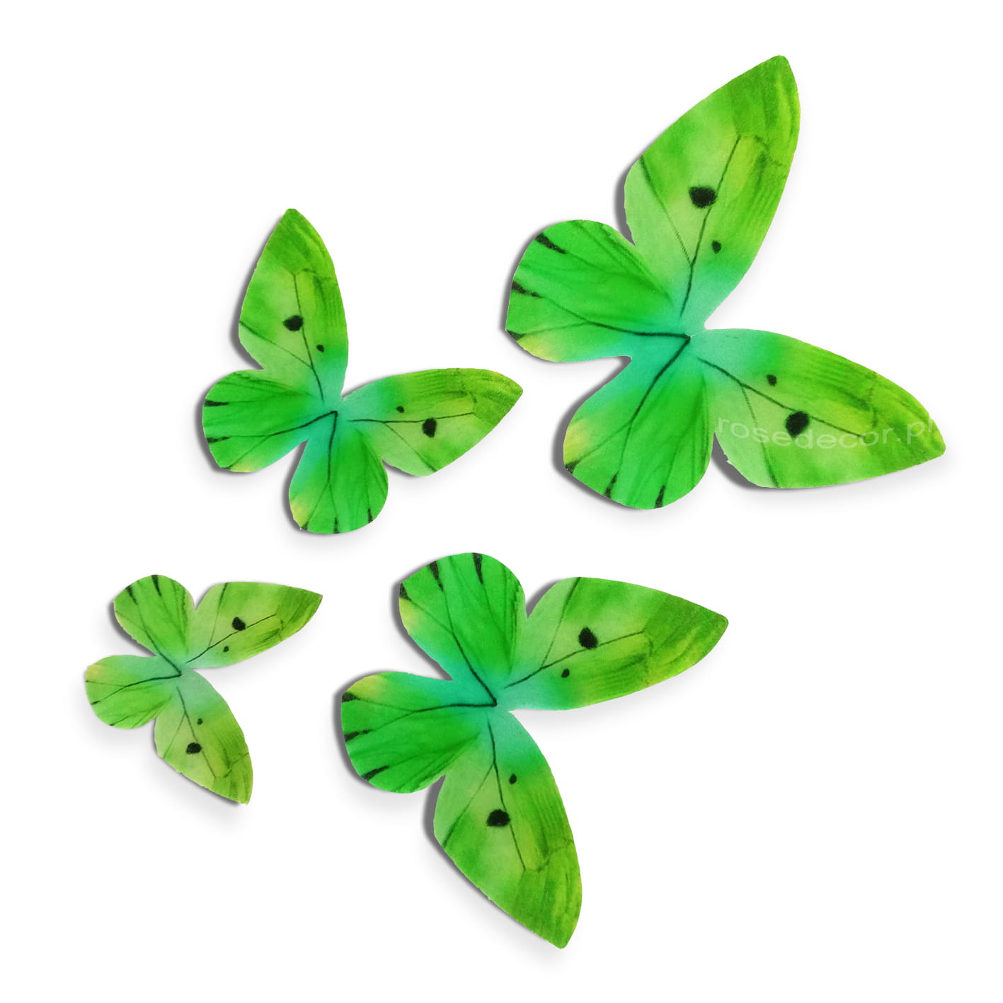 Zielone motyle to efektowna ozdoba waflowa w kształcie motylka wykonana z opłatka. Zestaw pięknych motylków w zielonym kolorze. Wygląd zielonych motyli jest niepowtarzalny. Ozdoba jest bardzo łatwa w użyciu, lekka i oczywiście w 100% jadalna. Pozwala na stworzenie subtelnych, ulotnych dekoracji na tortach, przystawkach, wypiekach i wyrobach cukierniczych. Motyle mają bardzo delikatną strukturę. Wyroby powinno się dekorować tuż przed podaniem. Motylkowe ozdoby waflowe silnie pochłaniają wilgoć. Delikatne złożenie skrzydeł motylka pozwala uzyskać efekt 3D. Mają neutralny smak: nie wpływają na smak dekorowanych wyrobów. W opakowaniu mix czterech rozmiarów.