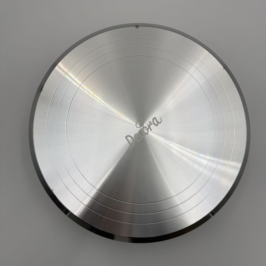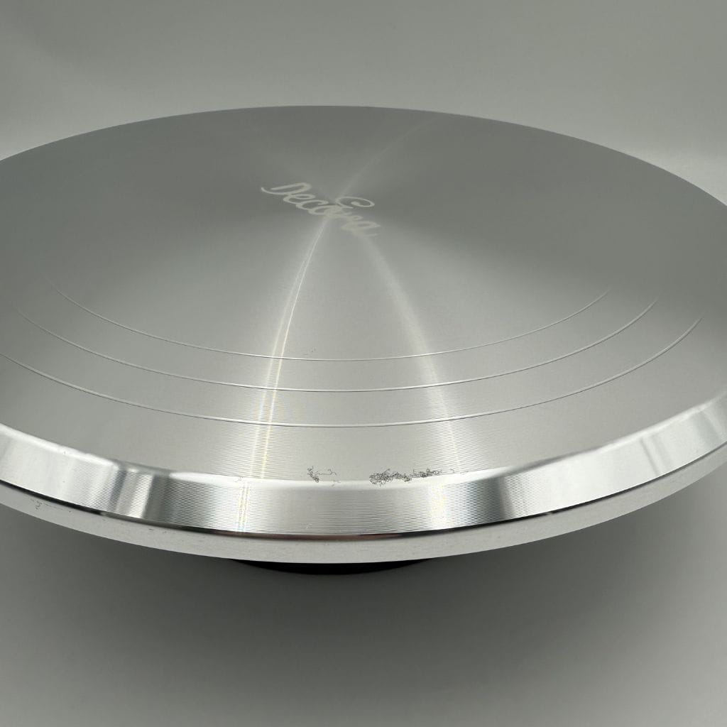 Profesjonalna patera obrotowa do tortów i ciast. Wykona z wysokiej jakości aluminium. Markowy produkt od renomowanej włoskiej firmy Decora. Duża patera o średnicy 31 cm; talerz obraca się płynnie w obie strony i nie kołysze się na boki. Platformę można obracać w dowolną stronę, podczas lukrowania, wygładzania czy zdobienia krawędzi. Wygodna zarówno dla osób prawo, jak i lewo ręcznych. Patera wyposażona jest w trzy rowki zapewniające prawidłowe ułożenie ciasta i posiada antypoślizgową gumową podstawę, którą można zdjąć. Antypoślizgowa podstawa gwarantuje większą stabilność i zapobiega przesuwaniu się podstawki po powierzchni podczas pracy. Ta patera to wspaniały pomocnik podczas każdego etapu przygotowywania tortu: od przekładania, poprzez tynkowanie po ozdabianie. Przed umieszczeniem ciasta na paterze należy najpierw umieścić na niej podkład. Produkty posiadają niewielkie defekty powierzchni powstałe podczas produkcji, bez wpływu na użytkową funkcjonalność.