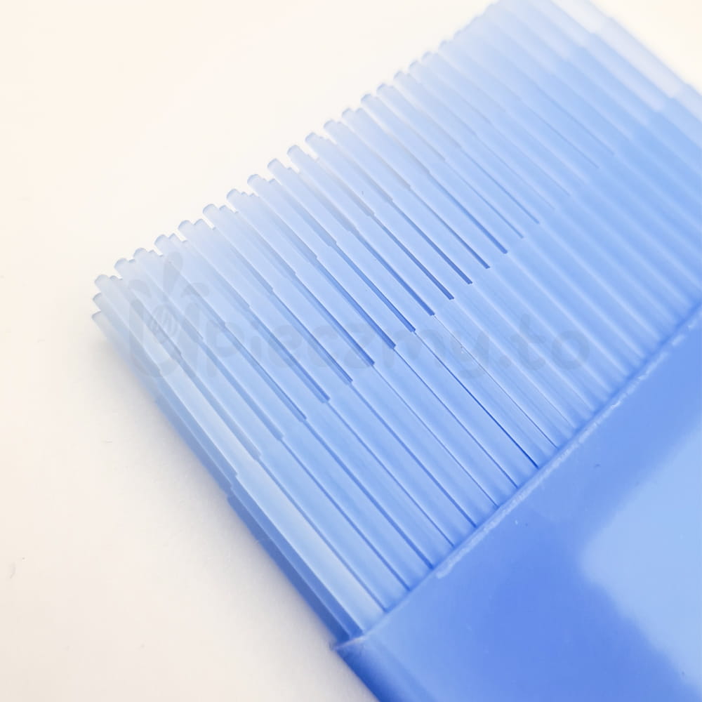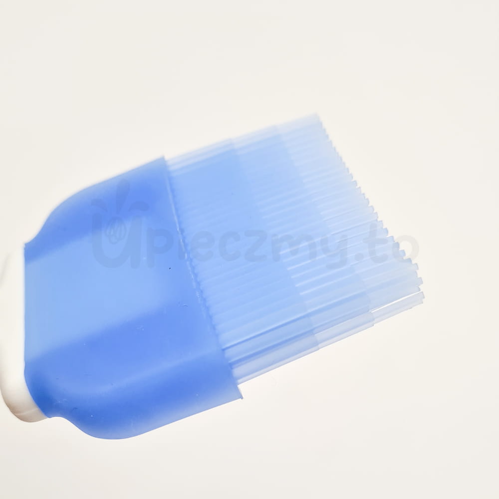 Niebieski pędzel silikonowy z białą rączką z tworzywa sztucznego. Rączka wykonana jest z poliamidu dodatkowo wzmocnionym włóknem szklanym. Odczepiane włosie ma szerokość 4 cm, długość 3 cm i jest wykonane z niebieskiego silikonu. Pędzel posiada praktyczny otwór do zawieszania. Jest odporny na wysokie temperatury do 220°C. Nie przywiera do gorących powierzchni i nie odkształca się, nie chłonnie zapachów, nie nasiąka płynami! Można go umyć w gorącej wodzie albo zmywarce: włosie łatwo oddzielić od uchwytu.