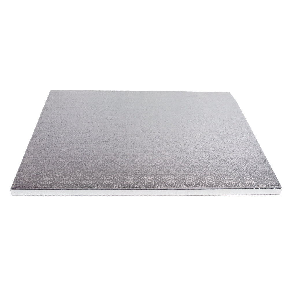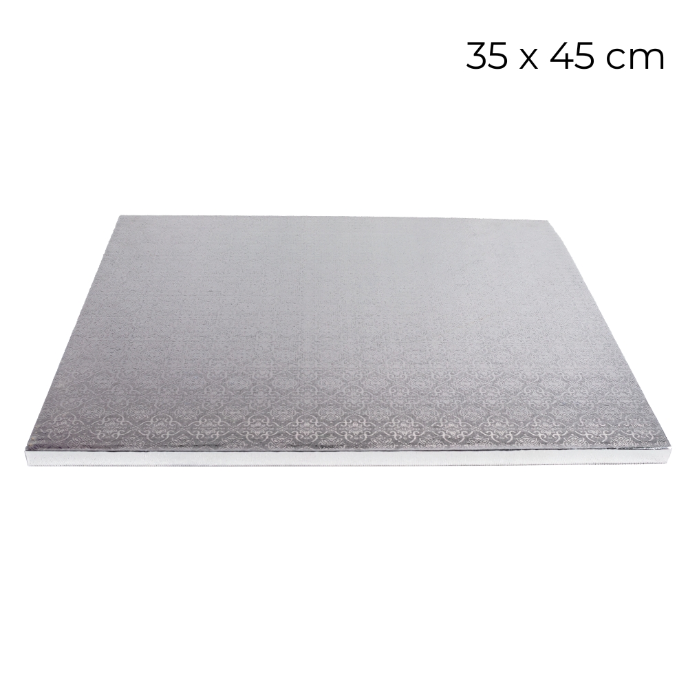 Podkład pod tort lub ciasto, prostokątny, bardzo sztywny i gładki, dzięki czemu nic z wyprodukowanych słodkości nie popęka podczas przenoszenia. Podkład jest powleczony jednym kawałkiem, srebrnej folii, która mocno się trzyma i nie odkleja. Piękny wytłoczony wzór na powierzchni. Od spodu podkład jest wykończony białym papierem. Przeznaczony do kontaktu z żywnością. Odporny na tłuszcz, wilgoć i zabrudzenia. Bardzo łatwo się go czyści: wystarczy przetrzeć wilgotną szmatką. Można bezpośrednio na nim tynkować.