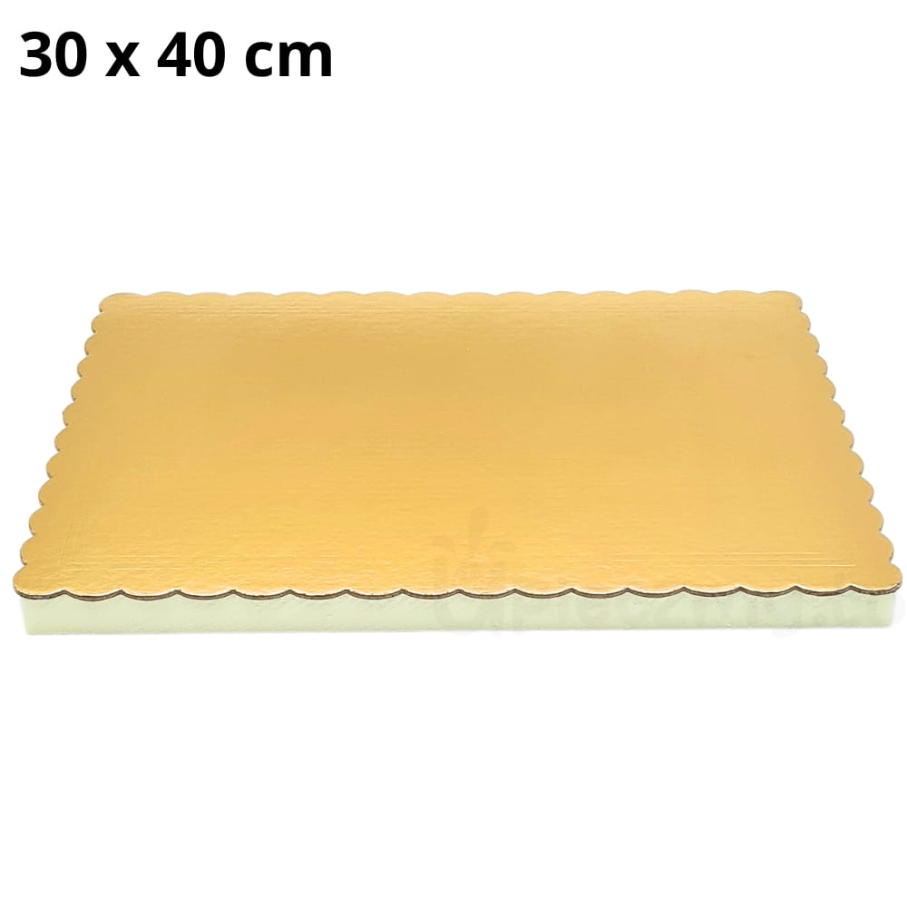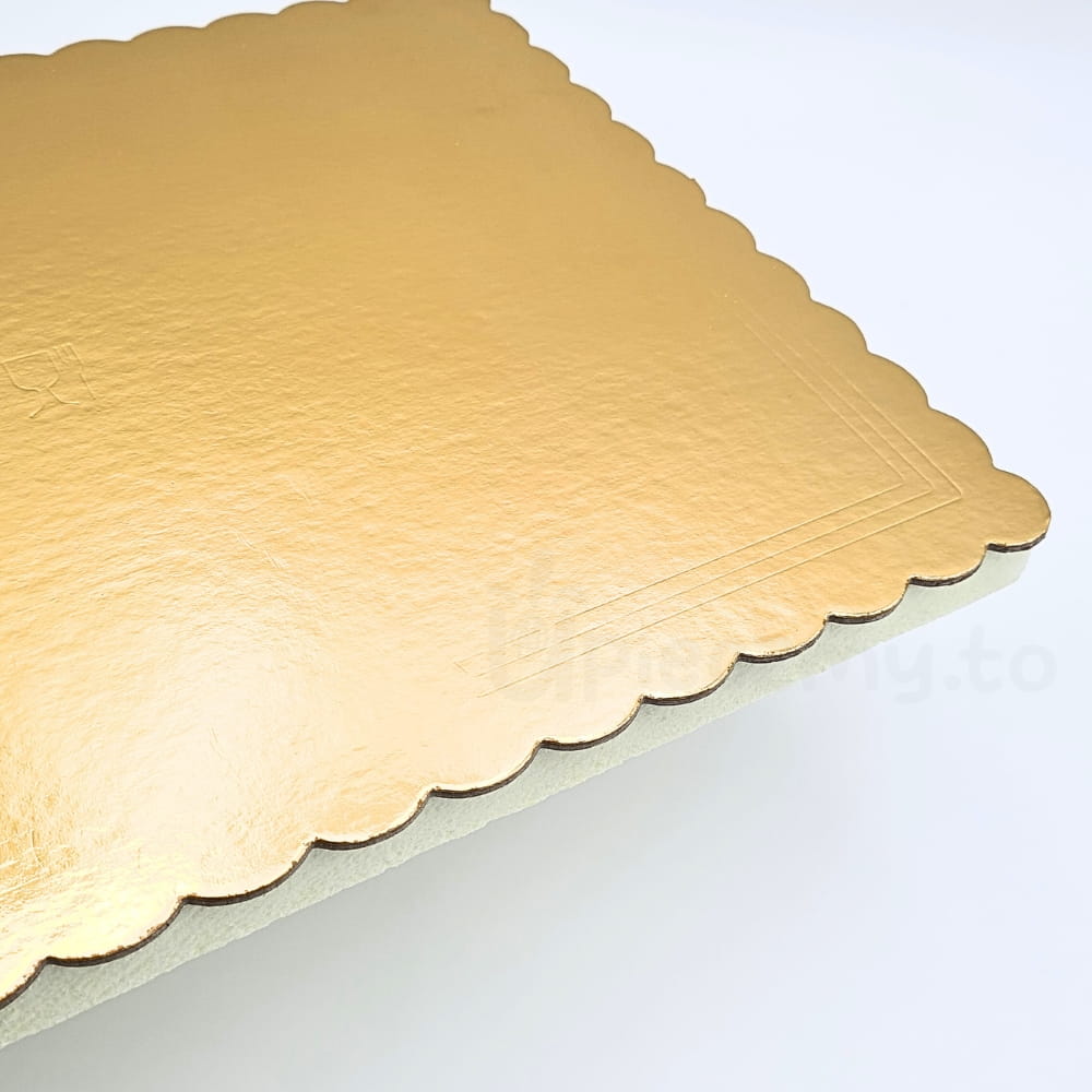 Złoty podkład pod tort w stylu angielskim. Ultra lekki, a zarazem bardzo sztywny: bezpiecznie utrzyma na sobie nawet bajkowo ozdobione, uginające się od ciężaru słodkości wypieki. Wykonany z bardzo grubego styroduru: 22 mm. Podkład ma przyklejoną od góry złotą podkładkę. Z falowanymi, ząbkowanymi brzegami. Złota podkładka pokryta jest specjalną folią, która czyni go odpornym na tłuszcz i zabrudzenia. Można bezpośrednio na nim tynkować i jest przeznaczony do kontaktu z żywnością. Znaczna grubość styroduru pozwala użyć ozdobnej wstążki lub taśmy i rozpocząć dekoracje już od samego podkładu!