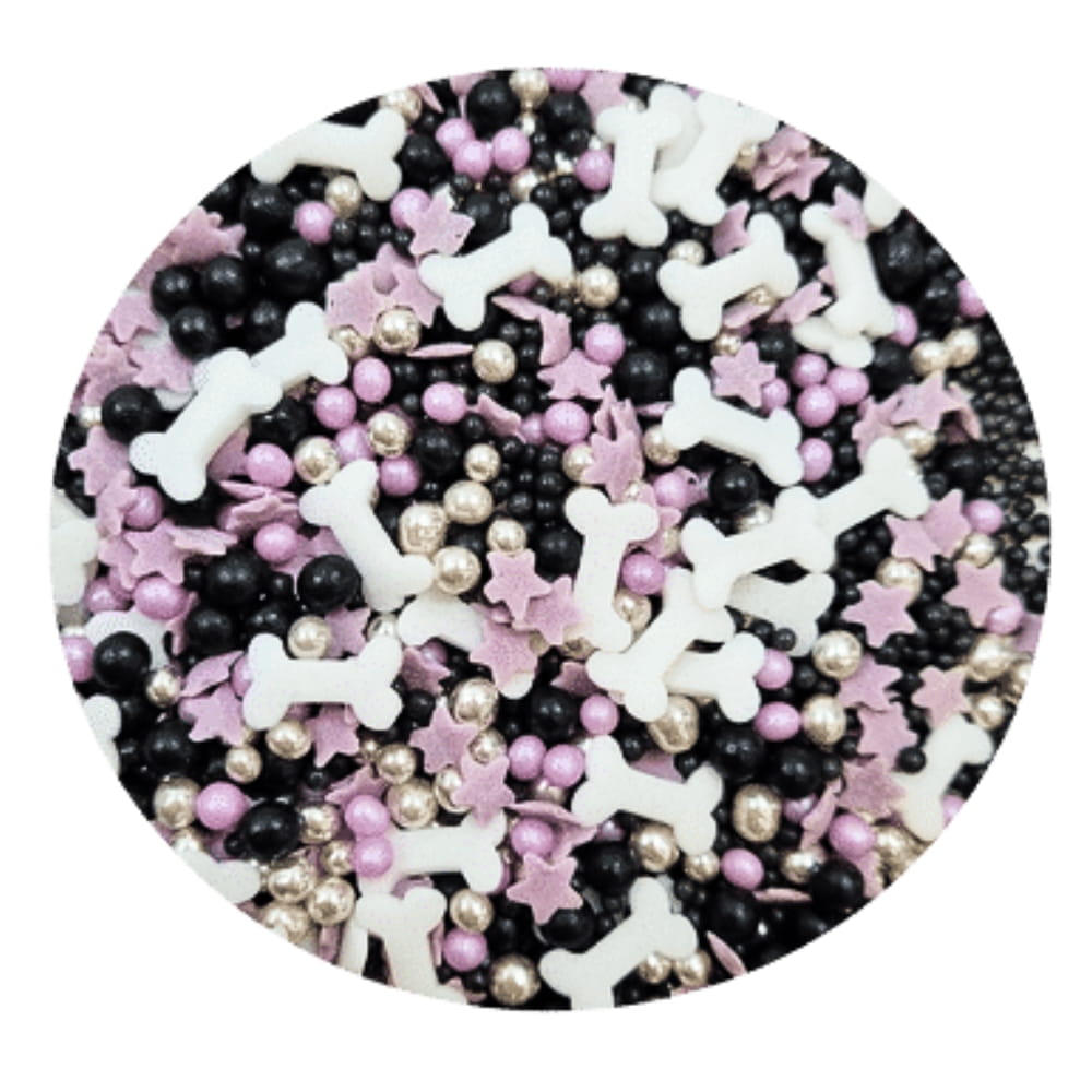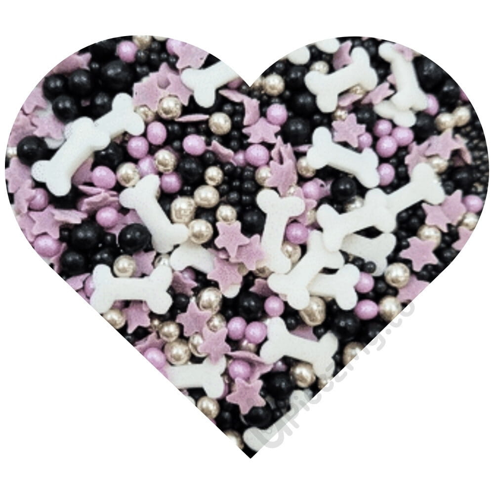 Posypka cukrowa mix kości to fantastyczna, gotowa kompozycja w poręcznym zamykanym pojemniczku. W skład starannie wyselekcjonowanej kompozycji wchodzą: białe kostki i fioletowe gwiazdki, fioletowe, czarne i srebrne lśniące perełki, to wszystko dopełnione drobnymi, czarnymi maczkami. Całość zapewnia bardzo halloweenową, nastrojową kolorystykę. Niezwykłe połączenie różnych kształtów: lśniących perełek, białych kosteczek, malutkich gwiazdeczek i drobniejszych maczków tworzy wspaniały, przebogaty efekt. Pozwala ciekawie udekorować: torty, muffinki, ciasta desery, cake pops, ciasteczka, pierniczki i wszelkie rodzaju wypieki. Możemy stworzyć zachwycające dekoracje, doskonałe do ozdabiania urodzinowych i halloweenowych tortów, wypieków i wszelkich słodkości związanych z nastrojem bajkowych potworów.